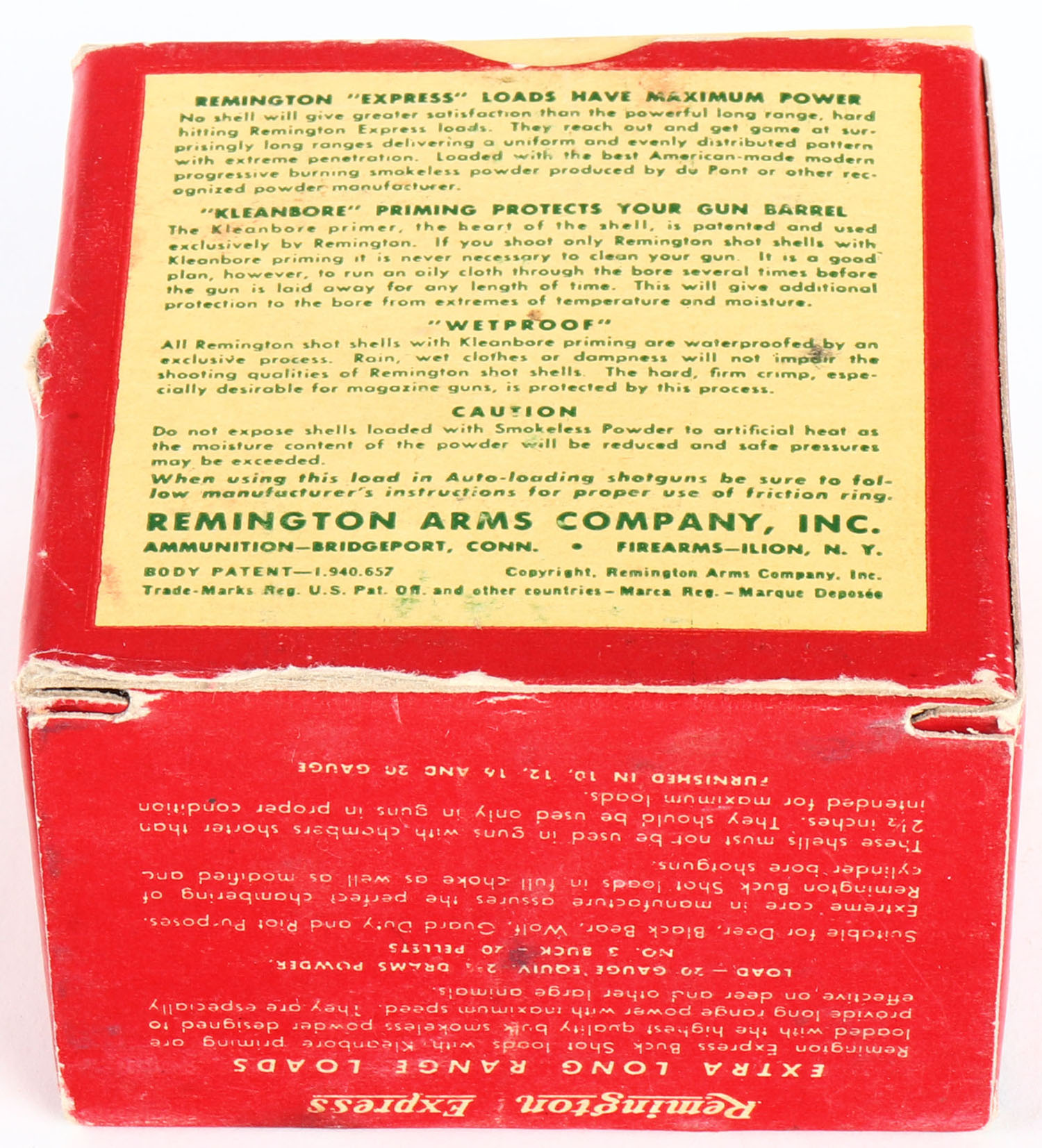 Remington Express, Extra Long Range, 12ga., 2 1/2'', 1pc., Full, shot size 3 Buck 20 Pellets, box is white, yellow, red and green, box has small shell protrusions with very nice colors, shells are excellent. Grade: Very Good ++ - Value: 10 to 50