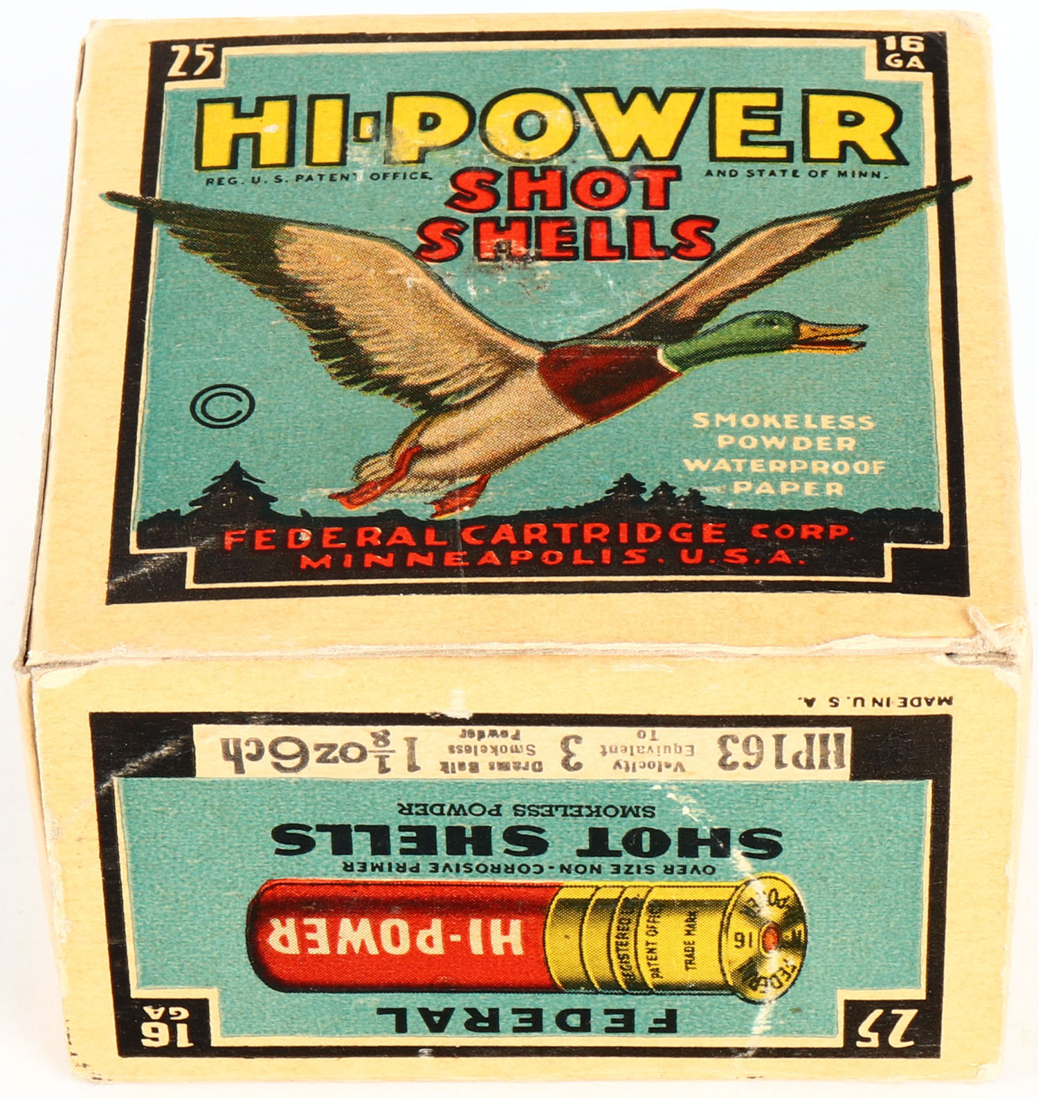 Federal Cart. Co., HI-POWER, 16ga., 1pc., Full, shot size 6ch, Black border, blue, yellow and red box with flying mallard, box has light scuffing & light soiling with very nice colors, Shells are excellent. Grade: Very Good ++ - Value: 10 to 40