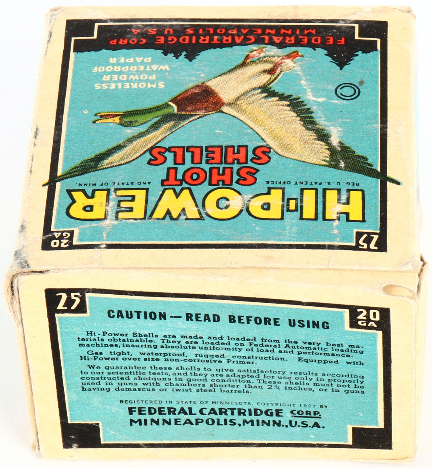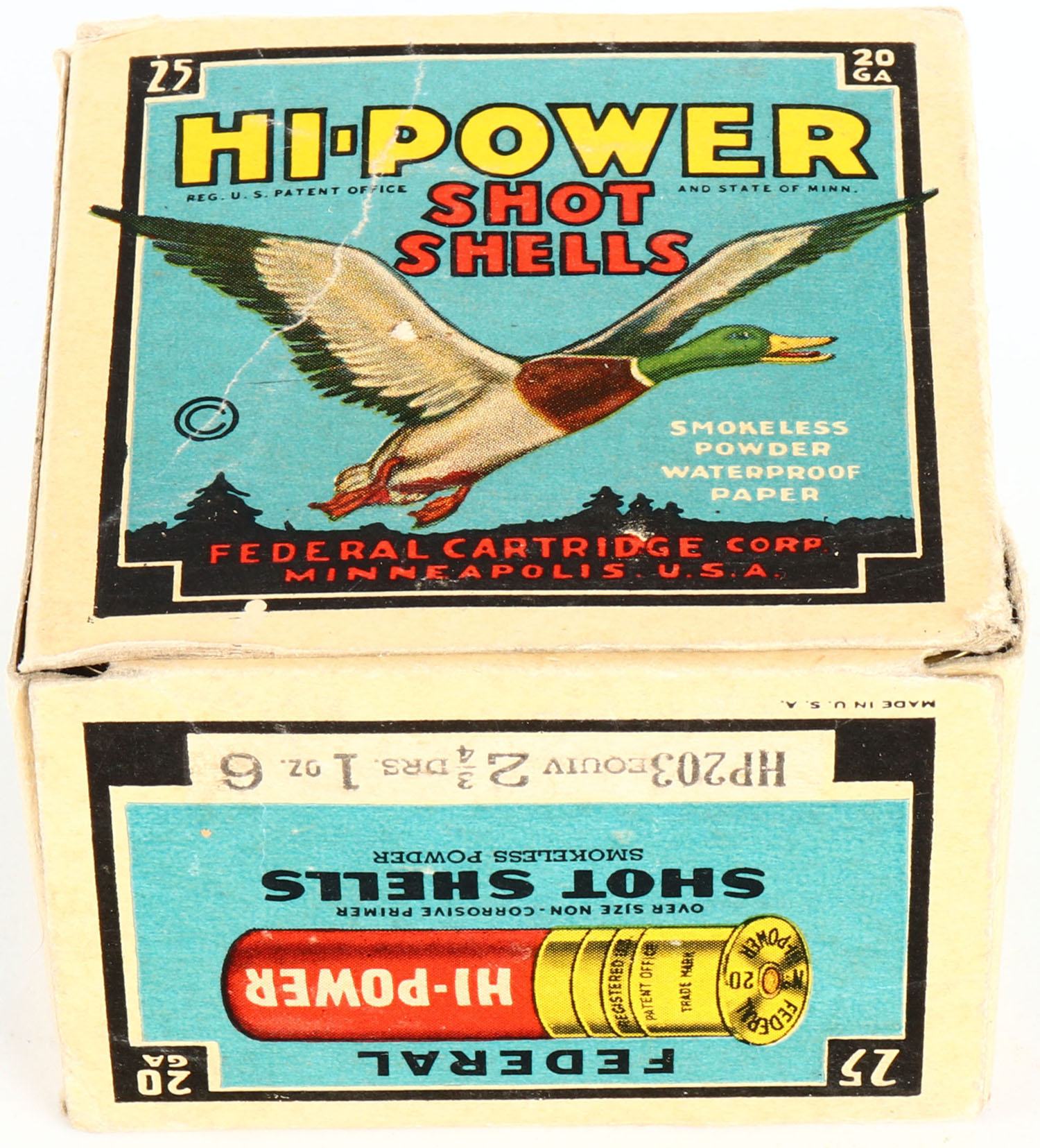 Federal Cart. Co., HI-POWER, 20ga., 1pc., Full, shot size 6, Black border, blue, yellow and red box with flying mallard, box has edge wear & light scuffing with very nice colors, Shells are good. Grade: Very Good ++ - Value: 10 to 40
