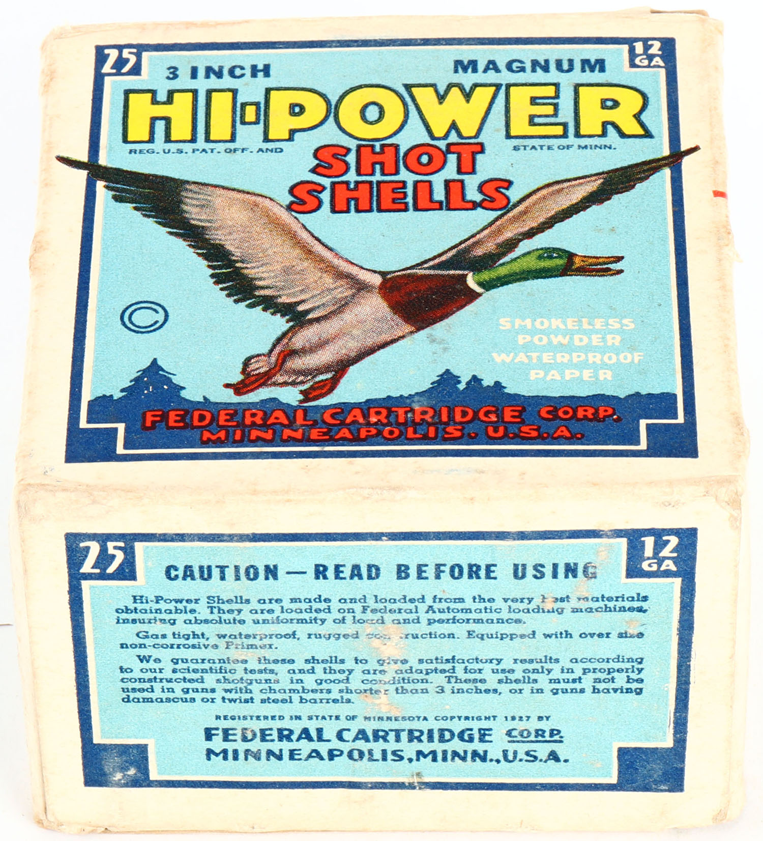 Federal Cart. Co., HI-POWER, 12ga., 1pc., Full, shot size 2 Superior Magnum, Blue border, blue, yellow and red box with flying mallard, box has light edge wear & light soiling with very nice colors, Shells are very good. Grade: Very Good ++ - Value: 10 to 50