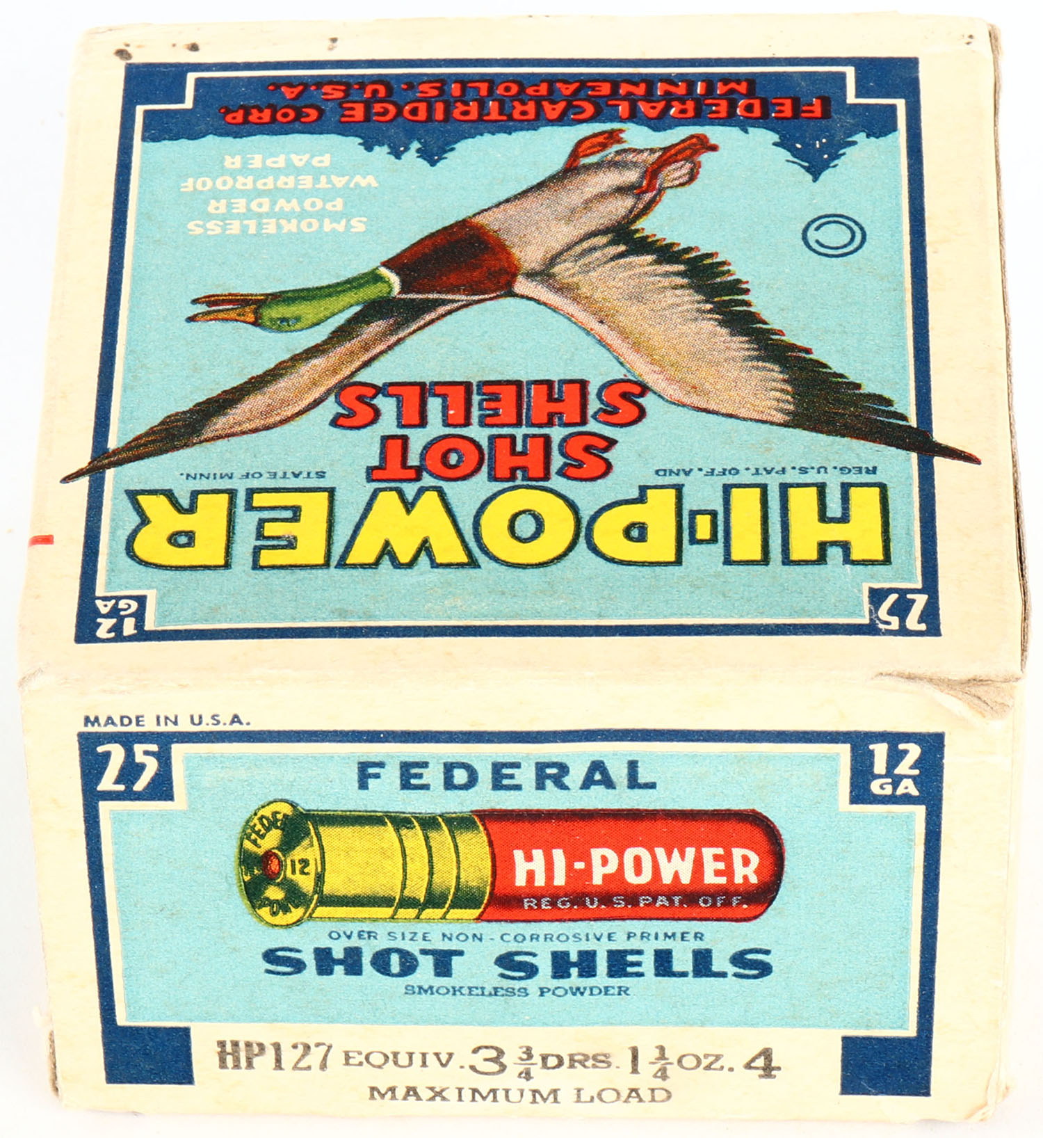 Federal Cart. Co., HI-POWER, 12ga., 1pc., Full, shot size 4 Maximum Load, Blue border, blue, yellow and red box with flying mallard, box has light scuffing & light soiling with very nice colors, Shells are excellent. Grade: Very Good ++ - Value: 10 to 50