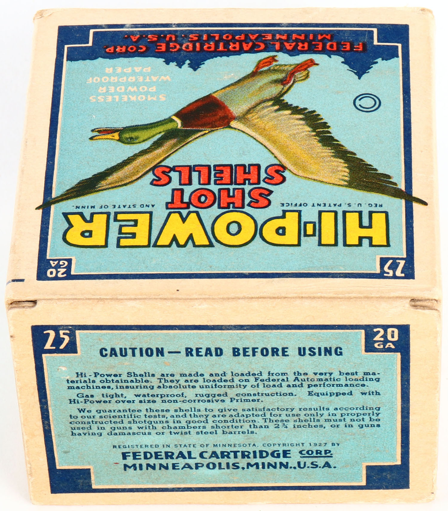Federal Cart. Co., HI-POWER, 20ga., 1pc., Full, shot size 5, Blue border, blue, yellow and red box with flying mallard, box has light soiling with very nice colors, Shells are excellent. Grade: Very Good ++ - Value: 10 to 50