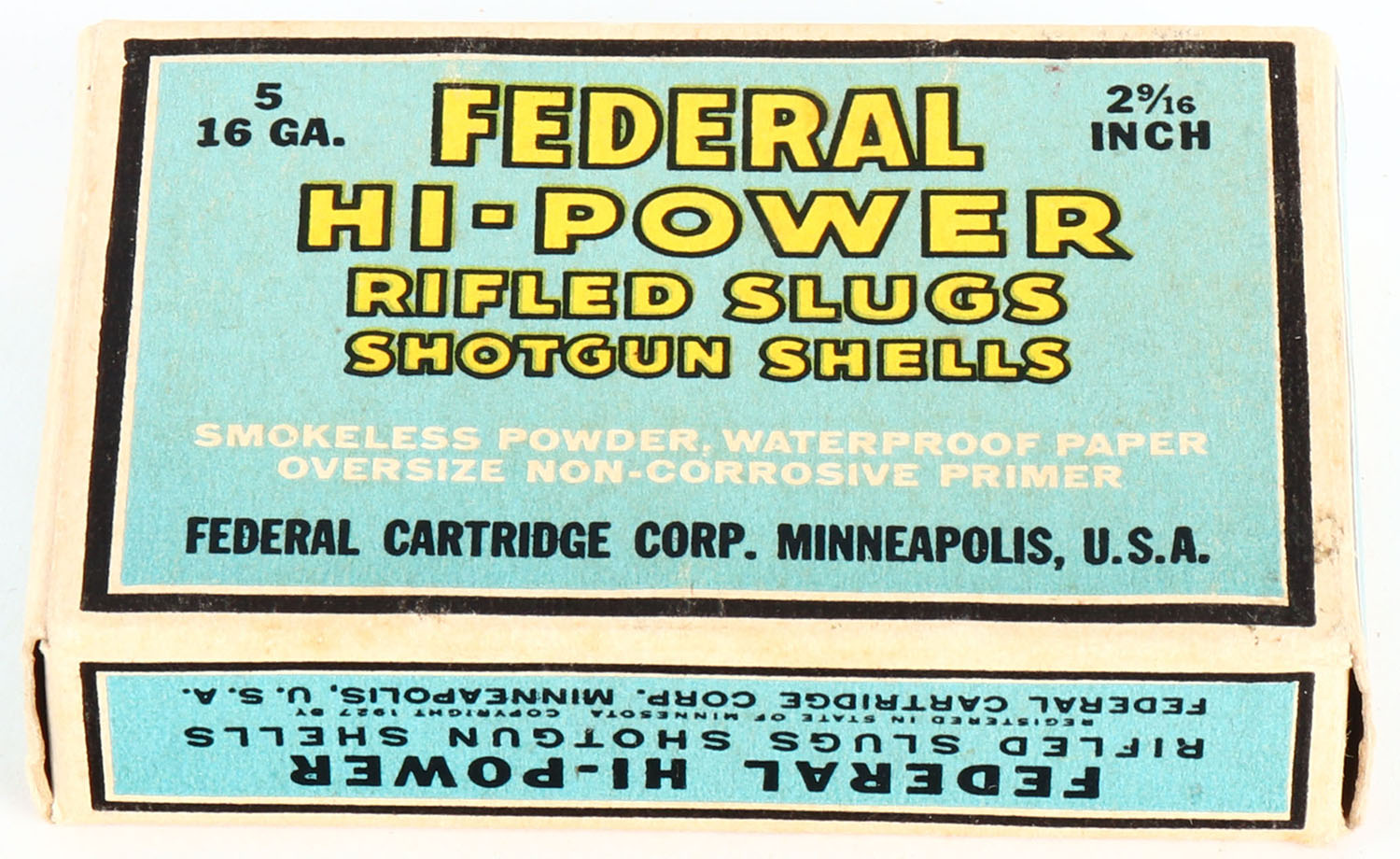 Federal Cart. Co., HI-POWER, 16ga., 2 9/16'', 1pc., Full, shot size Rifled Slugs, Black border, blue, yellow and black box, box has light soiling with very nice colors, Shells are excellent. Grade: Very Good ++ - Value: 6 to 20