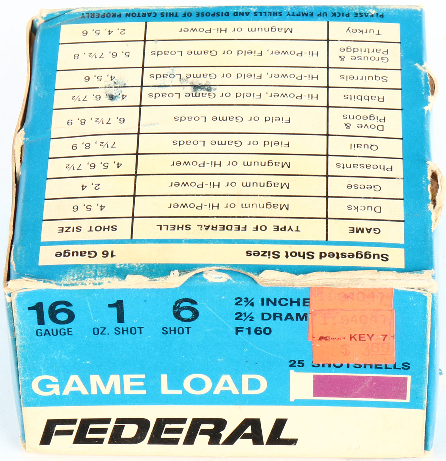 Federal, Game Load, 16ga., 1pc., Full, shot size 6, multi-colored box, shells are excellent. Grade: Very Good + - Value: 10 to 30