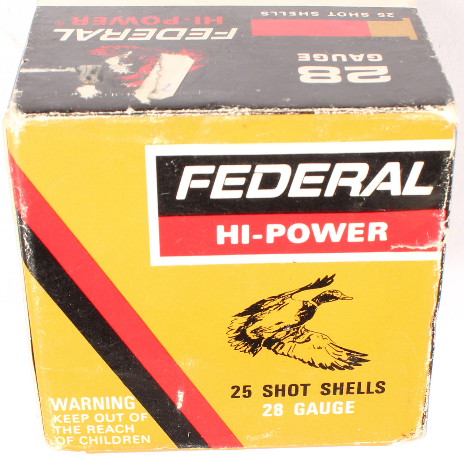 Federal, Hi-Power, 28ga., 1pc., Full, shot size 6 Maximum Load, multi-colored box, box is solid, shells are excellent. Grade: Very Good ++ - Value: 10 to 30