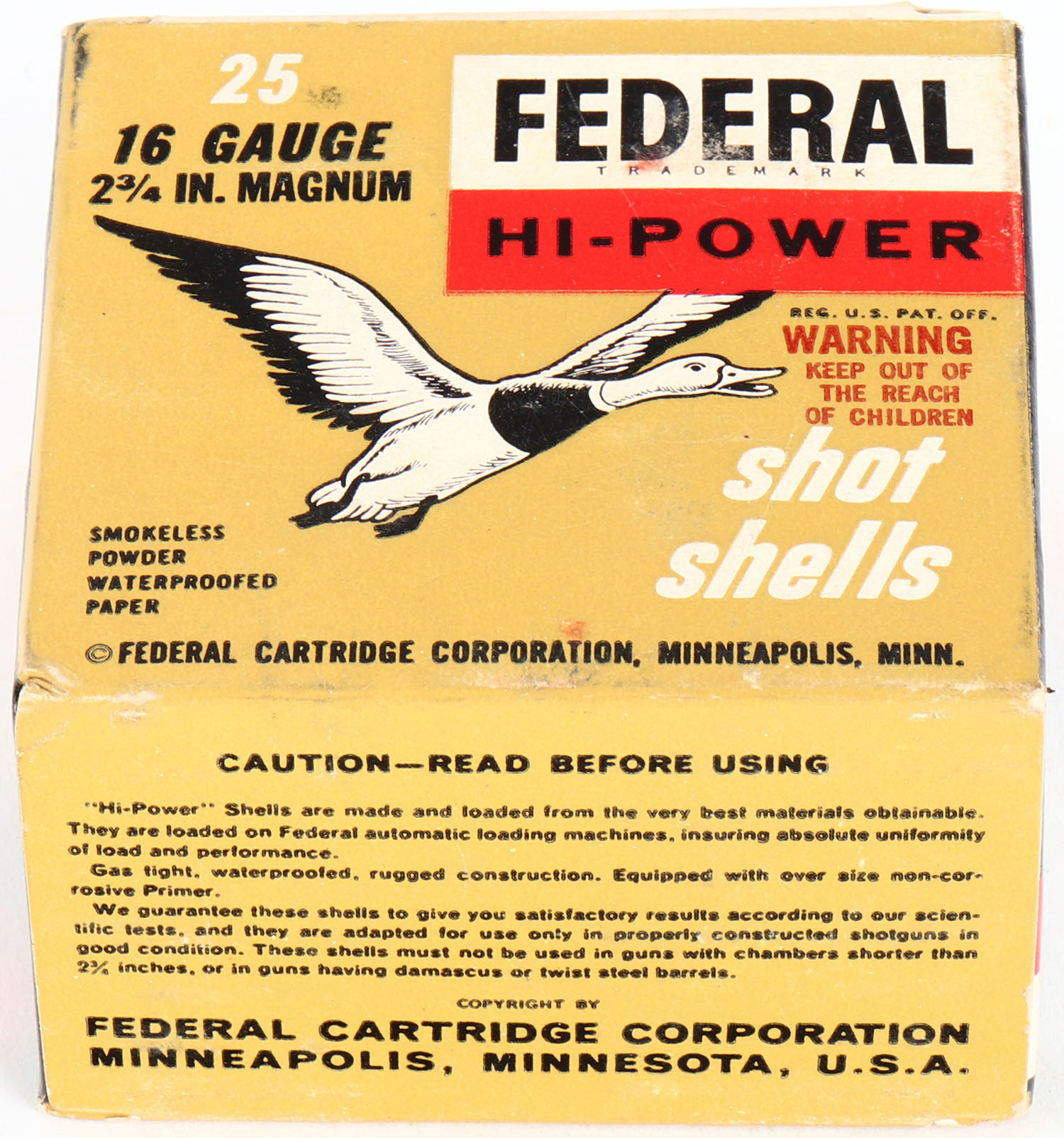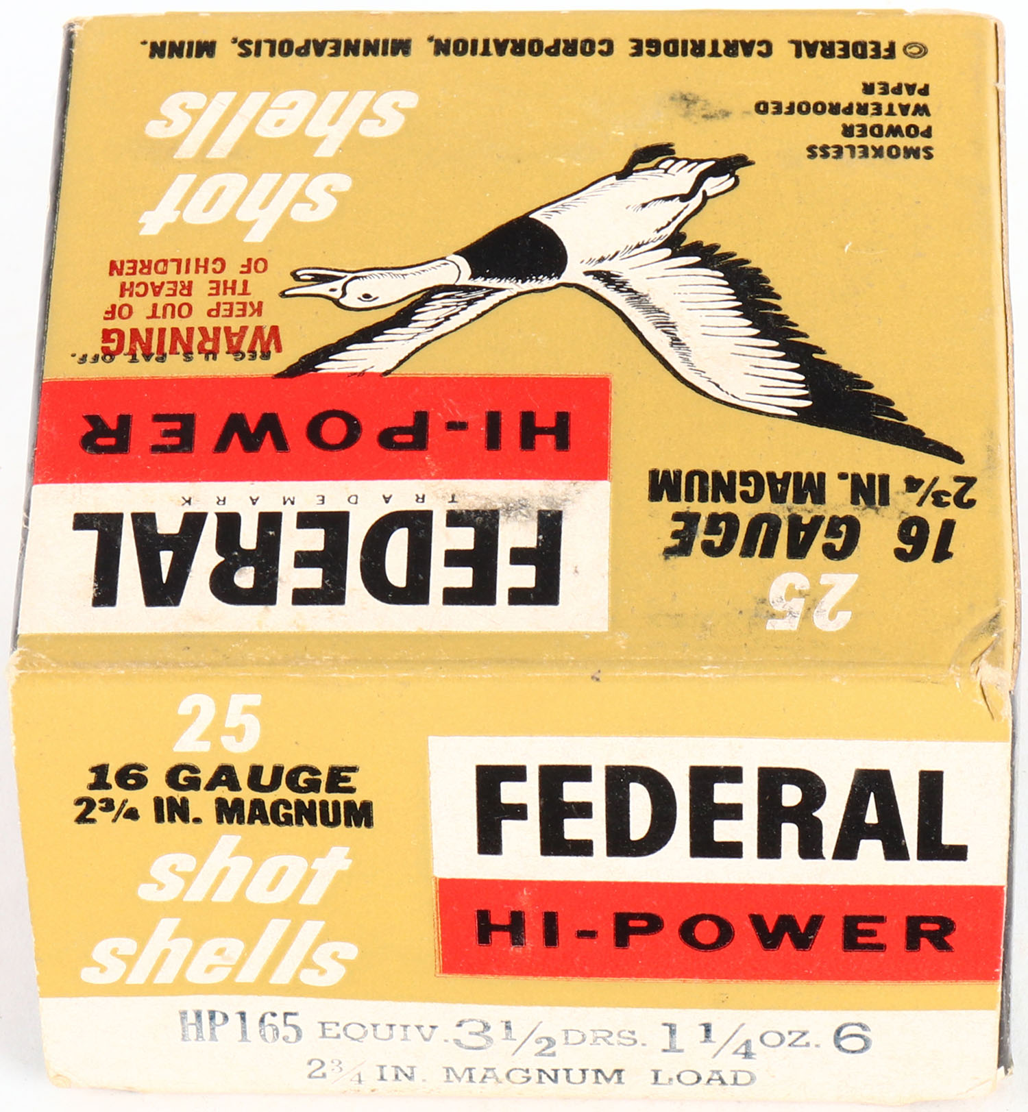 Federal, Hi-Power, 16ga., 2 3/4'', 1pc., Full, shot size 6 Magnum Load, multi-colored box, box is solid, shells are excellent. Grade: Very Good ++ - Value: 10 to 30