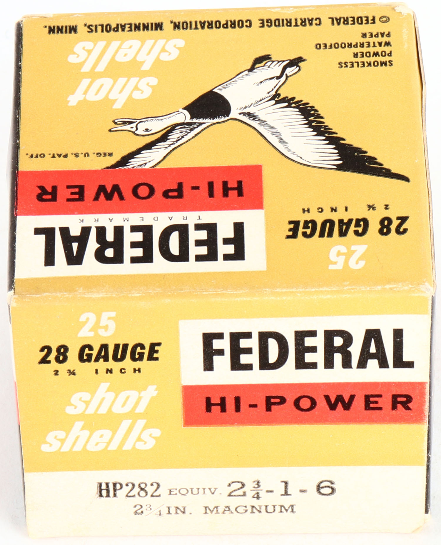 Federal, Hi-Power, 28ga., 2 3/4'', 1pc., Full, shot size 6 Magnum Load, multi-colored box, box is solid, shells are excellent. Grade: Very Good ++ - Value: 10 to 30