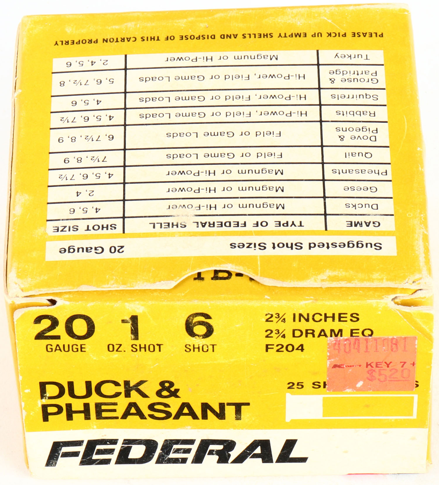 Federal, Duck & Pheasant, 20ga., 2 3/4'', 1pc., Full, shot size 6, multi-colored box, box is solid, shells are excellent. Grade: Very Good ++ - Value: 10 to 30