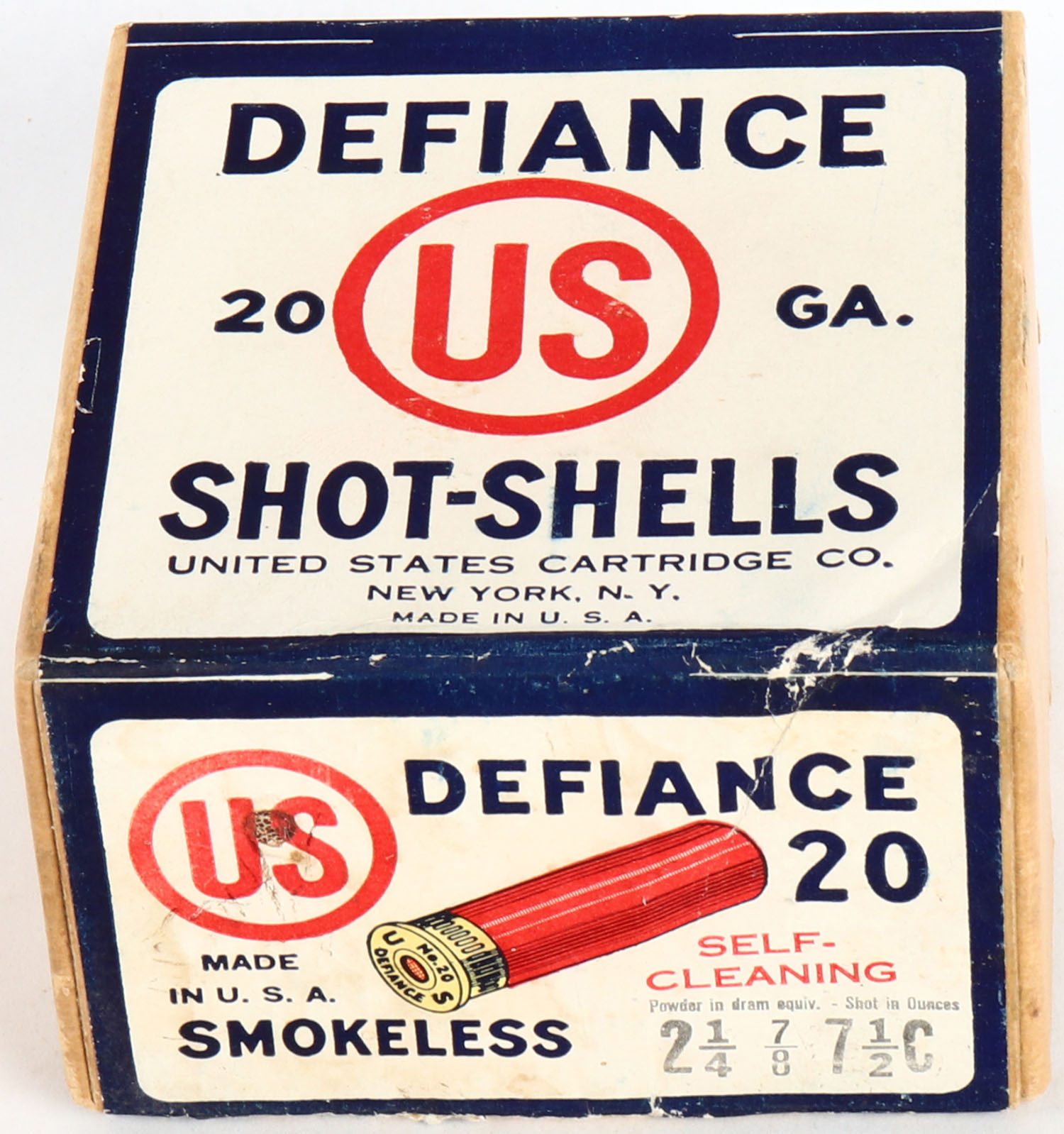 United States Cart. Co., New York, NY, DEFIANCE, 12ga., 2pc., Full, shot size 7 1/2 C, buff box with white, red & blue label, box has light soiling with very nice label. Grade: Excellent - Value: 60 to 250