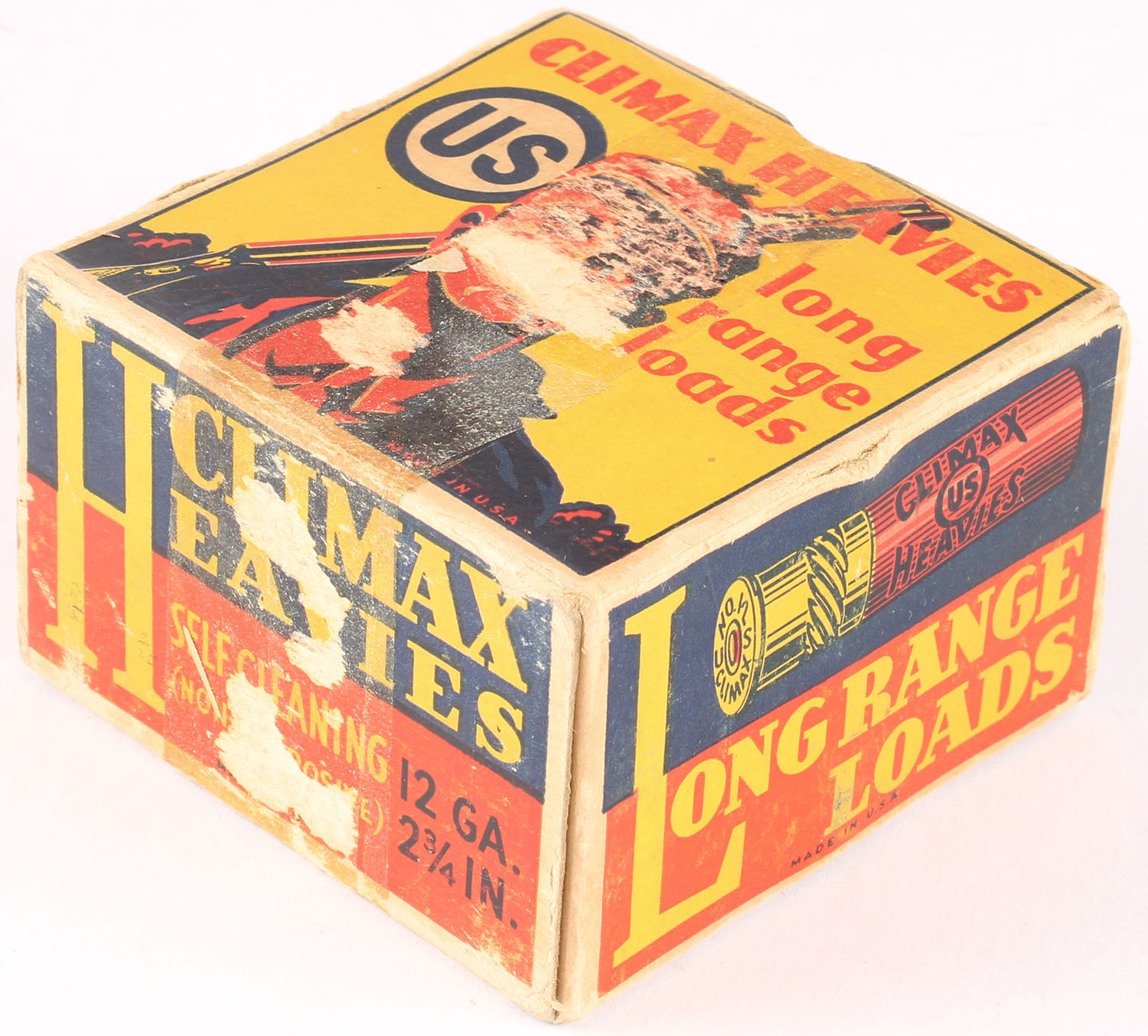 US Cart. Co., Happy Hunter Box, Climax Heavies, 12ga., 2 3/4'', 1pc., Full, shot size 6 CH, yellow, red, black & white box, box has scuffing, seam splits, edge wear, light soiling & top flaps are disconnected with nice colors, Shells are excellent. Grade: Very Good ++ - Value: 100 to 500