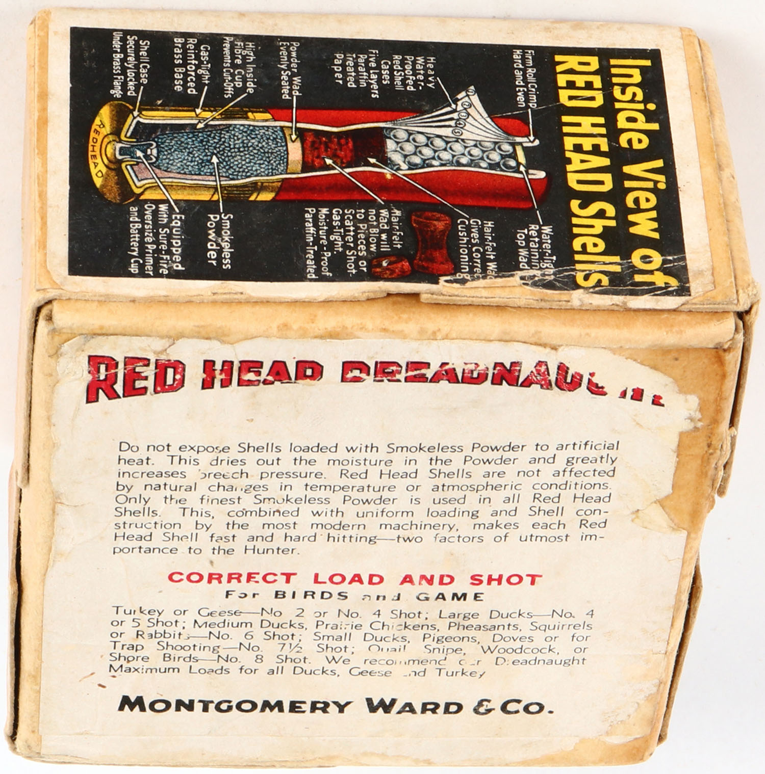 Montgomery Ward & Co., Red Head, DREADNAUGHT, 12ga., 2pc., Empty, shot size 5, buff box with multi colored scene & single goose flying, box has age soiling, edge wear & light scuffing with nice colors. Grade: Very Good ++ - Value: 40 to 200