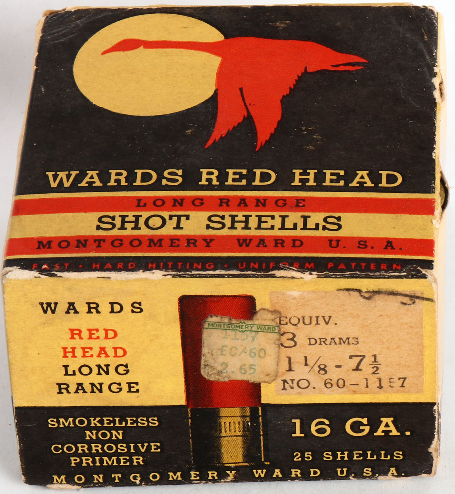 Montgomery Ward & Co., Red Head, 16ga., 1pc., Full, shot size 7 1/2, black background with red goose flying through the moon, box has shell protrusions, light edge wear & light soiling with nice colors, shells are excellent. Grade: Very Good ++ - Value: 20 to 80