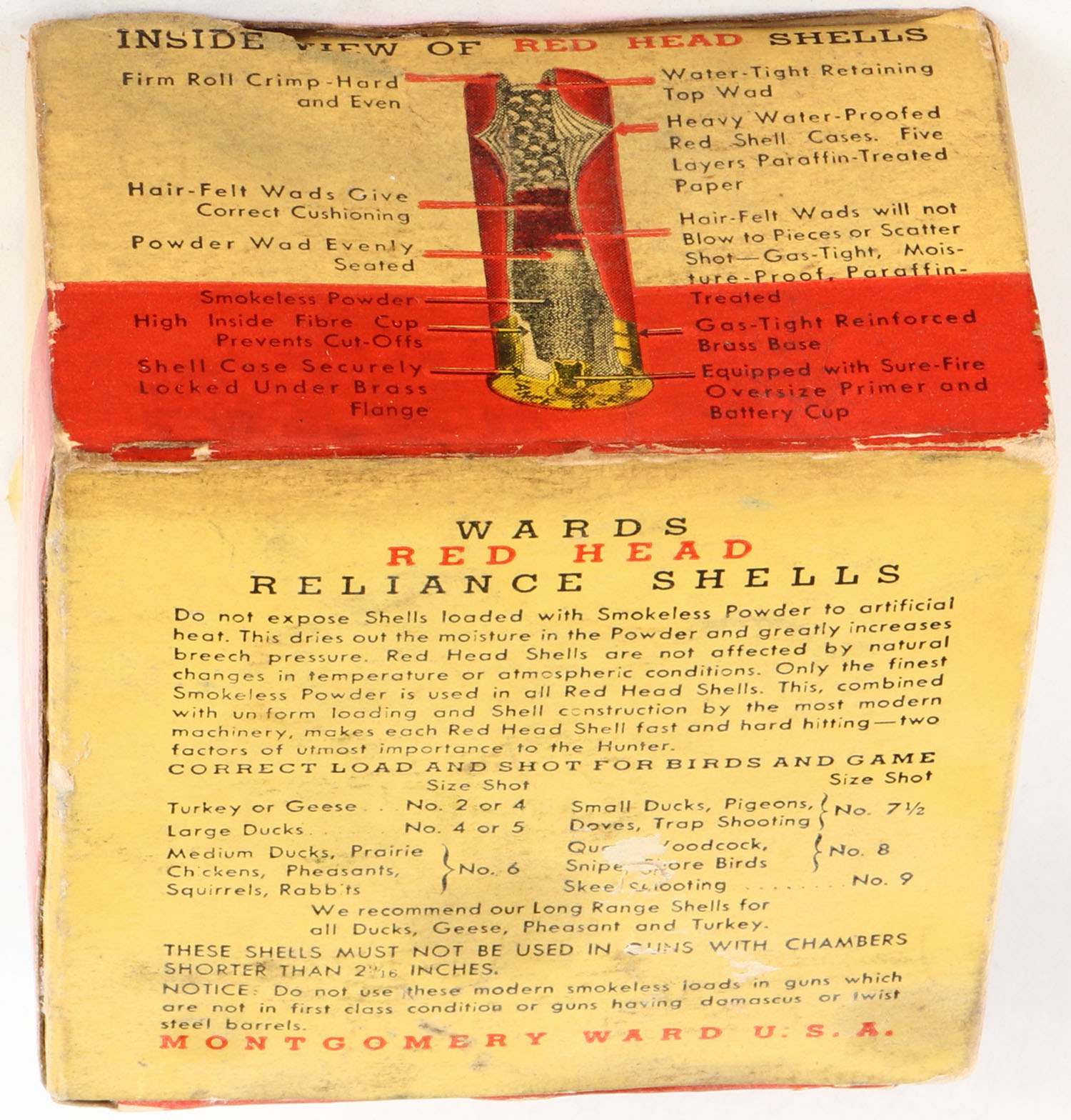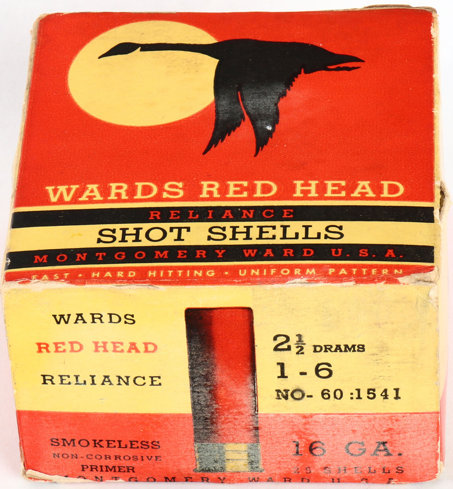 Montgomery Ward & Co., Red Head Reliance, 16ga., 1pc., Full, shot size 6, red background with black goose flying through the moon, box has soiling, light edge wear, small shell protrusion & small tear with very nice colors, Shells are excellent. Grade: Very Good ++ - Value: 20 to 80