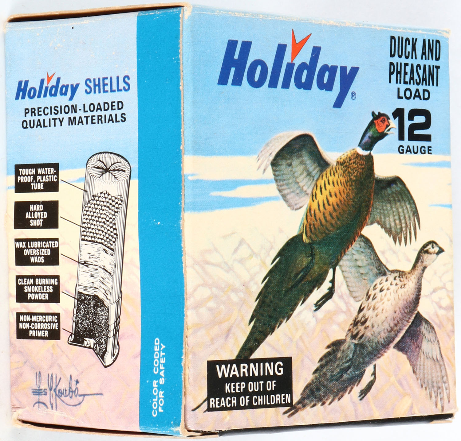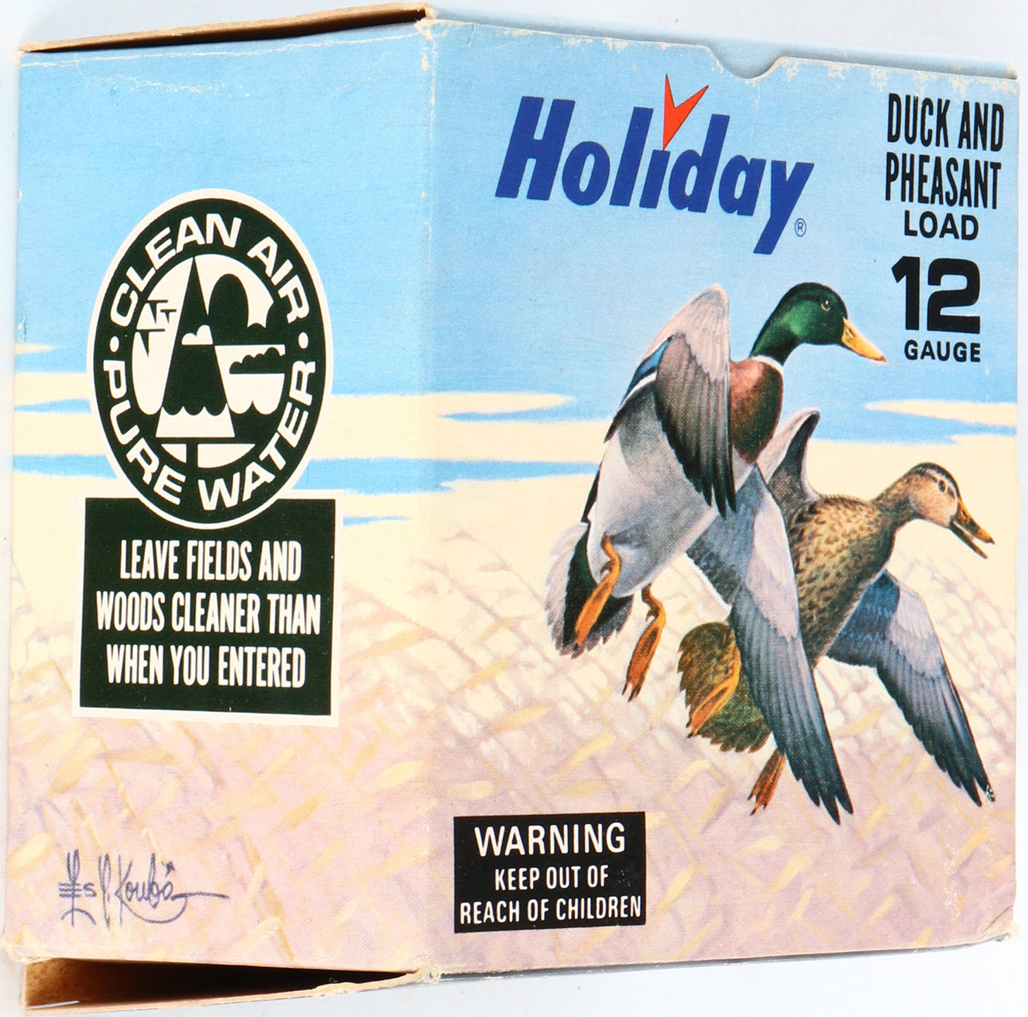 Holiday, Mallards/Pheasants, 12ga, 2 3/4'', 1pc., Full, shot size 5, multi color graphics by Les Kouba, box is very solid with light soiling, light scuffing & excellent colors, Shells are excellent. Grade: Very Good ++ - Value: 40 to 150