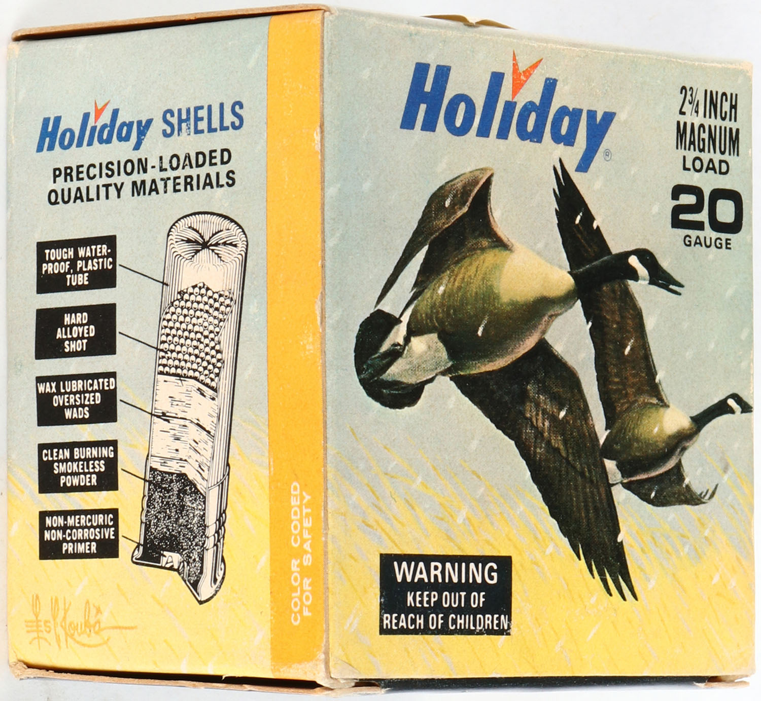 Holiday, Canvasbacks/Canada Geese, 20ga, 2 3/4'', 1pc., Full, shot size 4, multi color graphics by Les Kouba, box is very solid with light scuffing & excellent colors, Shells are excellent, HARD TO FIND! Grade: Excellent - Value: 50 to 200