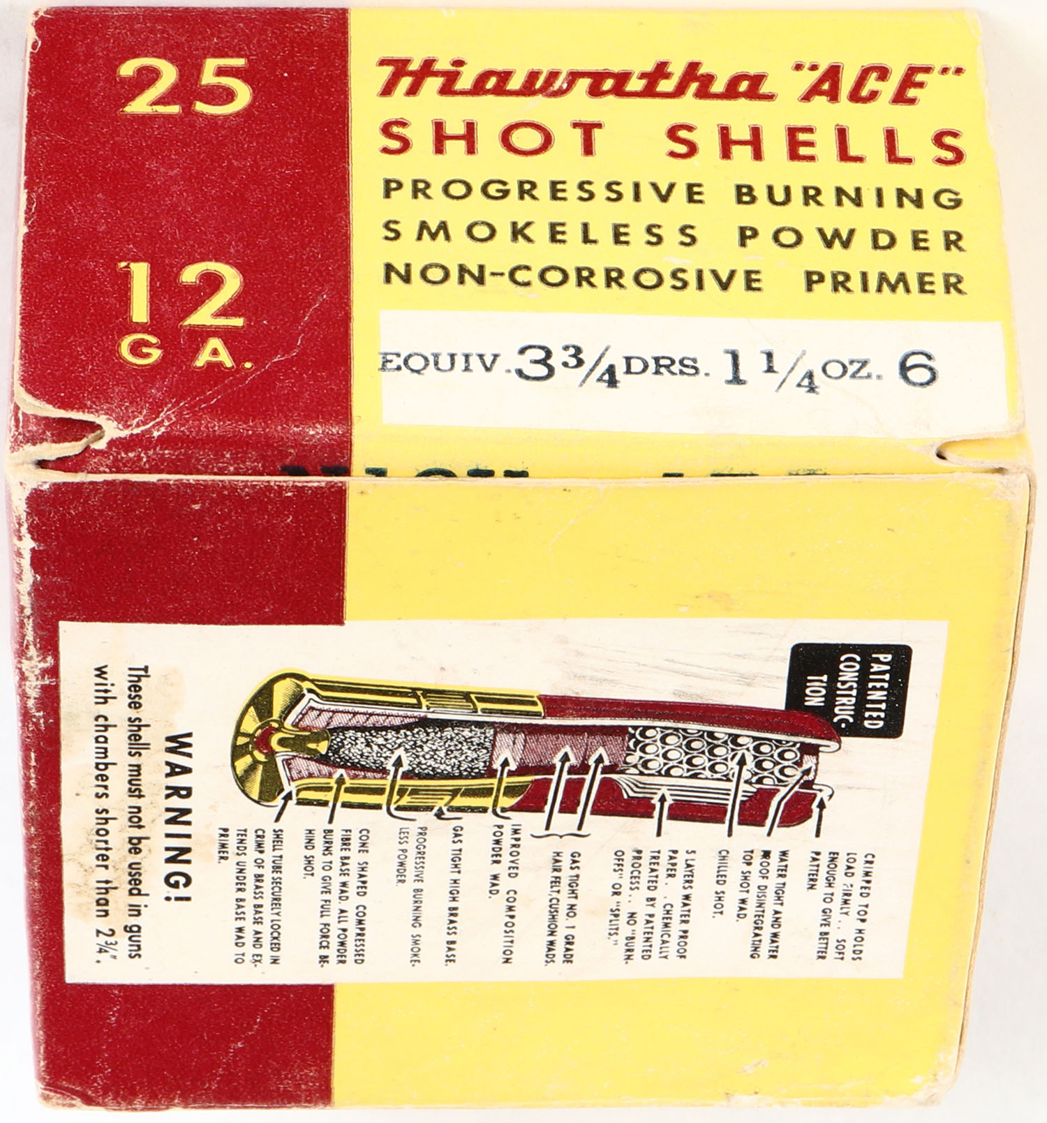 Gambles, Hiawatha ACE, 12ga., 1pc., Partial 10rds., shot size 6, yellow, maroon & white box, box is solid with very nice color, shells are excellent. Grade: Very Good ++ - Value: 6 to 30