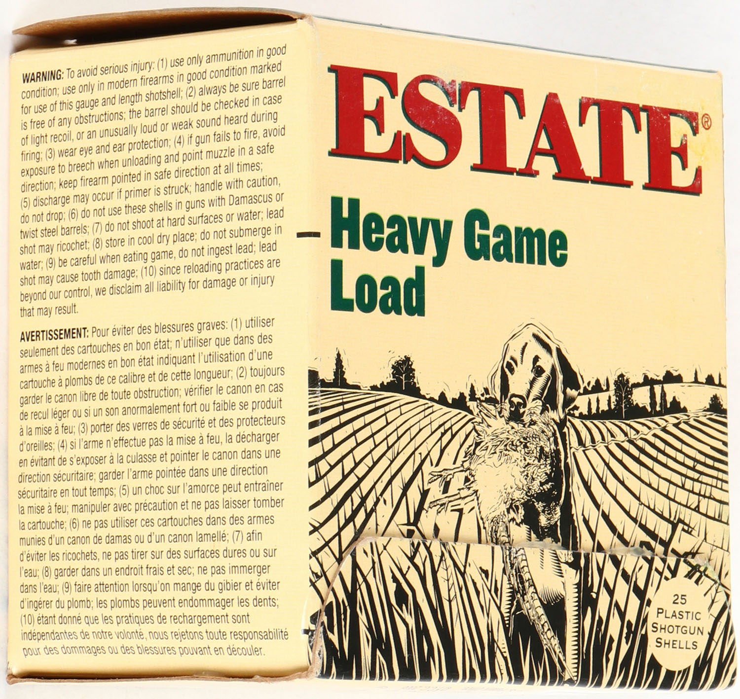 Estate, Heavy Game Load, 16ga., 2 3/4'', 1pc., Full, shot size 8, multi-colored box, box is solid with great colors, shells are excellent. Grade: Excellent + - Value: 10 to 20