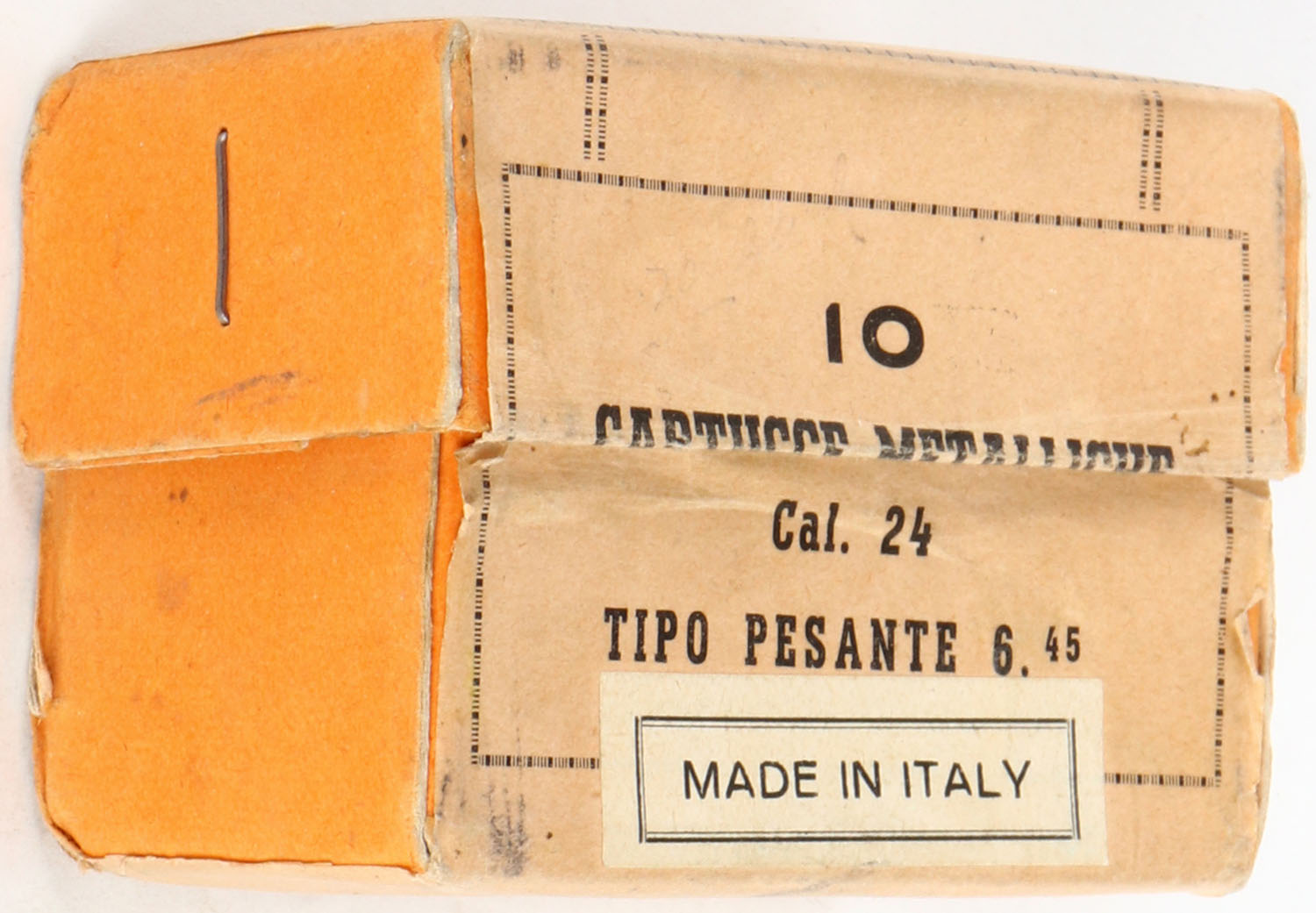 Early S. p. A Giulio Fiocchi, LECCO, 24ga., 2pc., Empty, unmarked shot size. Grade: Excellent - Value: 10 to 60