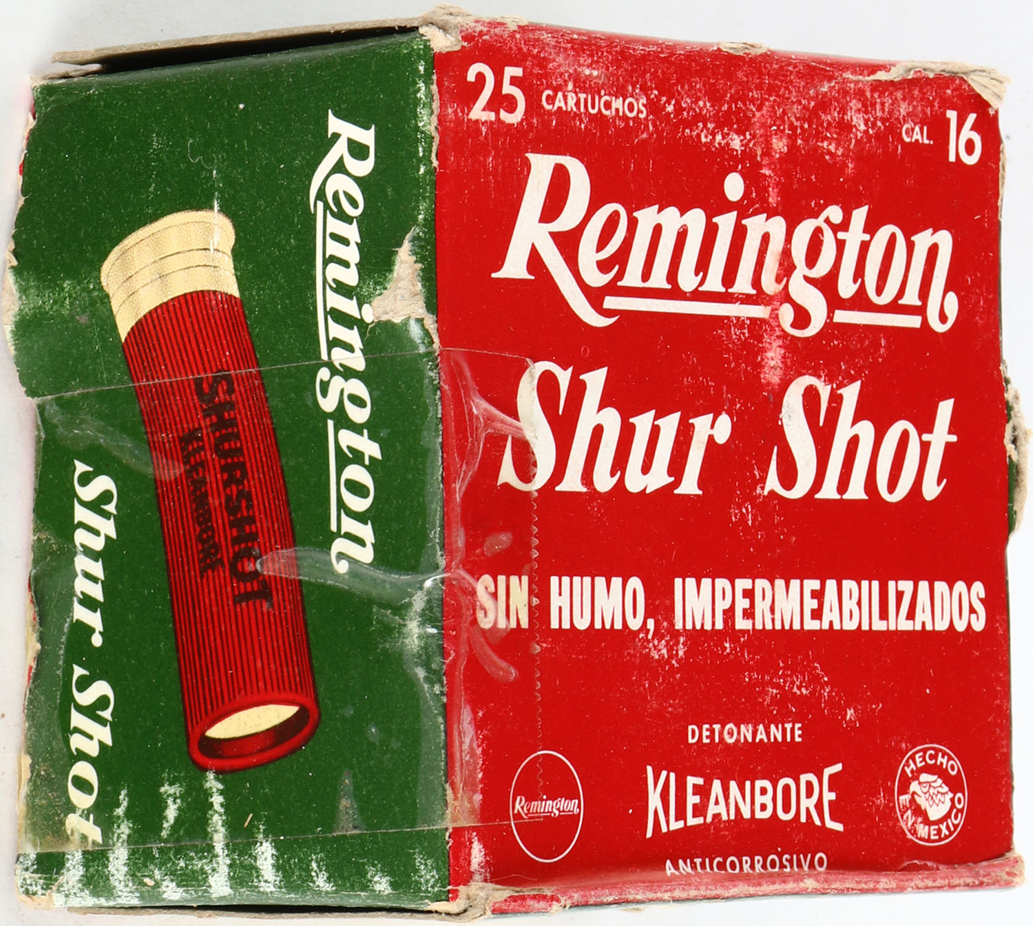 Remington, Shur Shot loaded in Mexico, 20ga., 1pc., Full, shot size BB multi-colored box, box shows wear, Shells are excellent. Grade: Very Good ++ - Value: 10 to 20