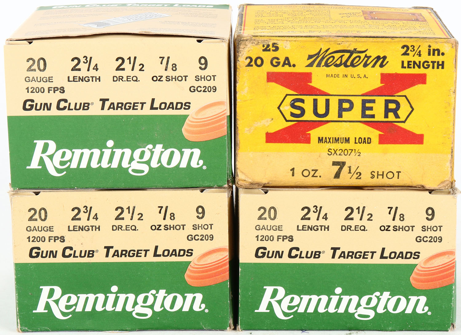 Lot of 4, Mixed Manufacture, 20ga., Appears Full, Shotshell Boxes. Grade: Very Good ++ - Value: 10 to 60