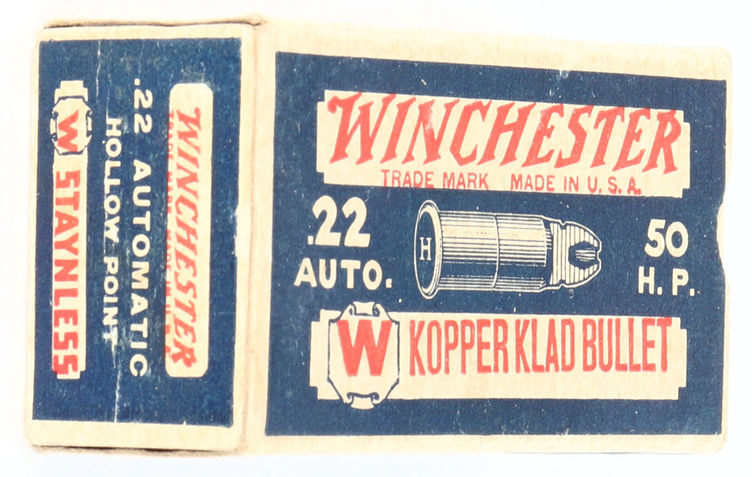 Winchester, Kopper Klad Bullet, .22 Auto. Hollow Point, RHWeb: WRA-12.5 WA-2Bc, Full, 1pc. Blue white & red box, box is solid with very good to excellent color, some age soiling, minor corner wear, edges are mostly crisp, end flaps are solid, ammo is very good to excellent. Grade: Excellent - Value: 40 to 120