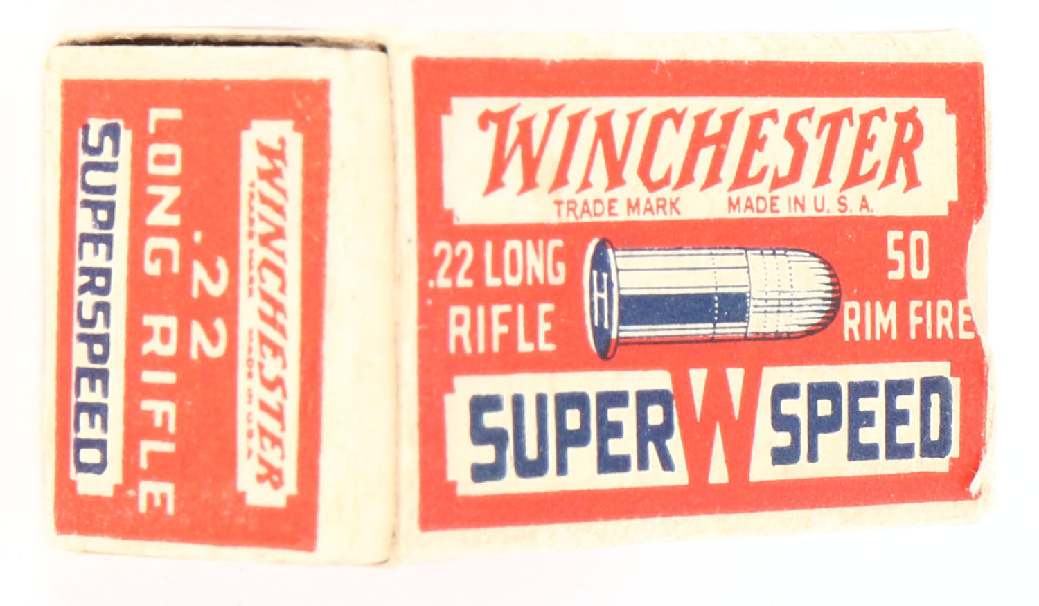 Winchester, Super Speed, .22 Long Rifle, RHWeb: WRA-13 LR-1b, Full, 1pc. Red white & blue box, box is solid with excellent color, very minor age soiling & corner wear, edges are crisp, end flaps are solid, ammo is excellent. Grade: Excellent - Value: 10 to 50