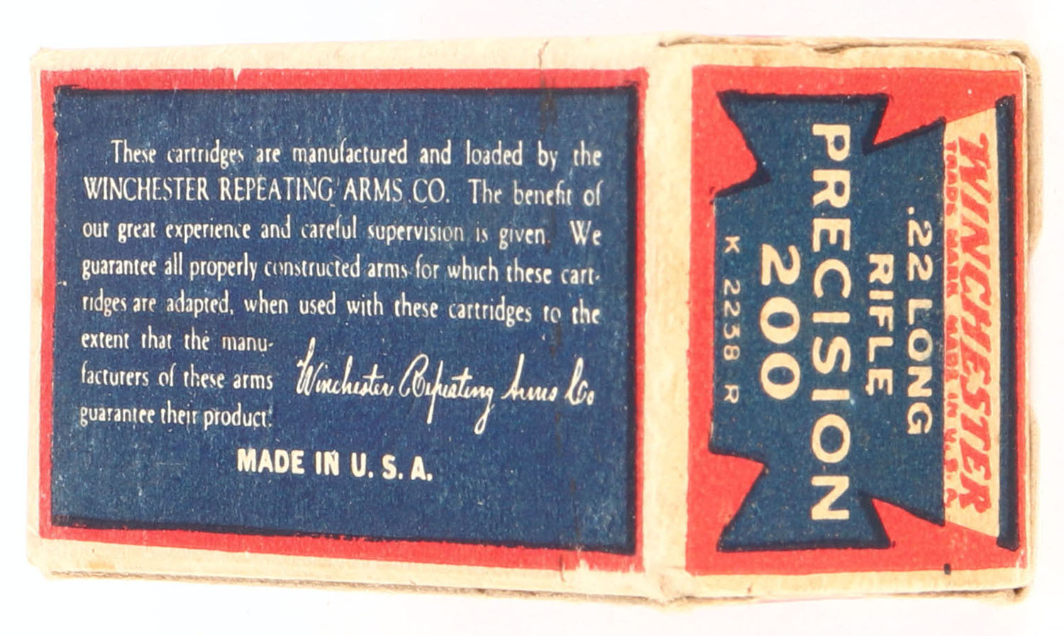 Winchester, .22 Long Rifle, Staynless Lead Greased, RHWeb: WRA-14A LR-1a, Army Lot 206, Partial 48rds., 1pc. Yellow blue & red box, box is solid with excellent color, minor age soiling, some corner wear, minor edge wear, end flaps are solid, ammo is excellent. Grade: Very Good ++ - Value: 40 to 120