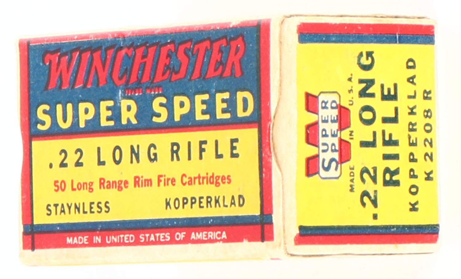 Winchester, Super Speed, .22 Long Rifle, Staynless Kopperklad, RHWeb: WRA-15 LR-1b, Full, 1pc. Yellow blue & red box, box is solid with excellent color, very minor edge & corner wear, end flaps are solid, ammo is excellent. Grade: Excellent + - Value: 10 to 40