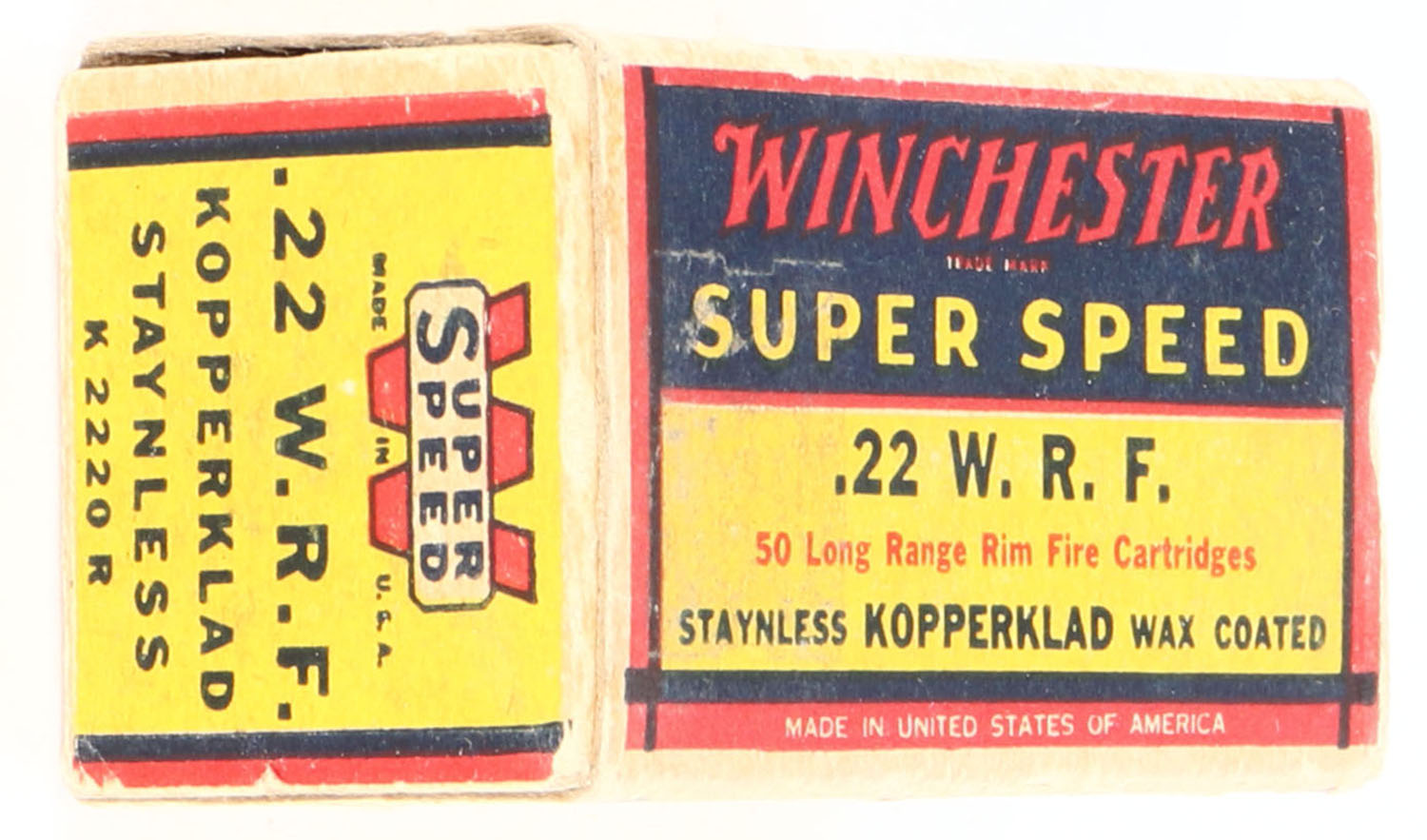 Winchester, Super Speed, .22 W.R.F., Staynless Kopperklad Wax Coated, RHWeb: WRA-15 WRF-1b, Full, 1pc. Yellow blue & red box, box is solid with very good to excellent color, some age soiling & corner wear, minor edge wear, end flaps are solid, ammo is excellent. Grade: Very Good ++ - Value: 20 to 80