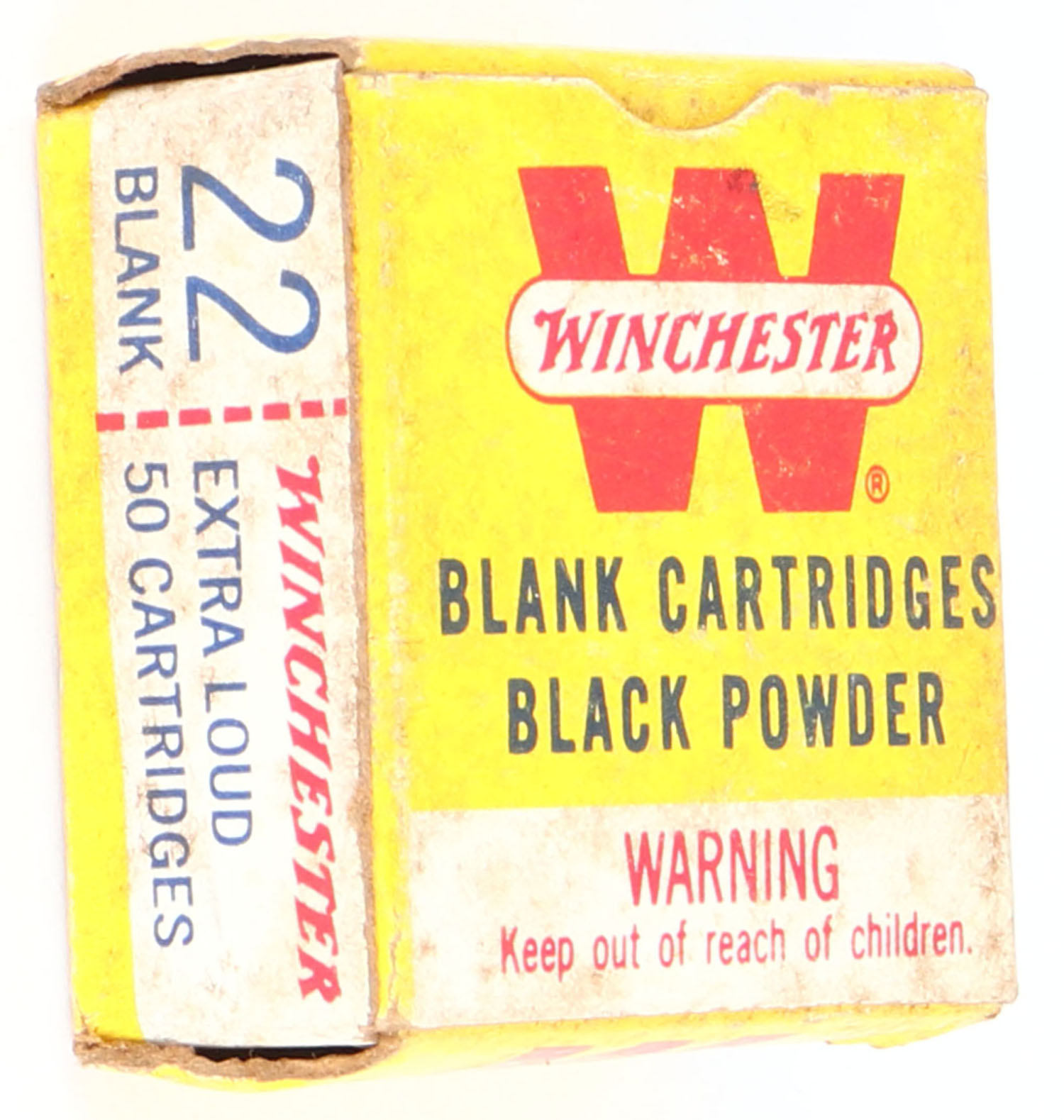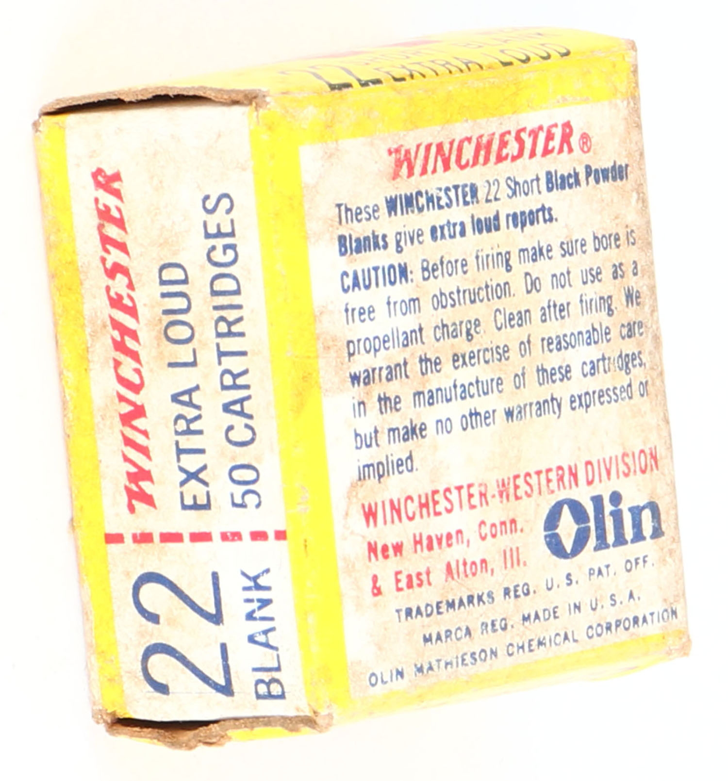 Winchester, Black Powder Blank Cartridges, .22 Short Blank, Extra Loud, RHWeb: WRA-20 S-1a, Full, 1pc. Yellow red & white box, box is solid with good color, age soiling, some edge & corner wear, end flaps are solid, ammo is good. Grade: Good ++ - Value: 4 to 20