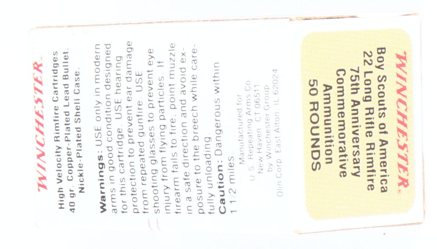 Winchester, Boy Scouts of America 75th Anniversary, .22 Long Rifle, RHWeb: WRA-70 LR-1, Full, 1pc. Multicolored box, box is mint with minty color, sharp corners, crisp edges, rigid end flaps, ammo is minty. Grade: MINT - Value: 10 to 50