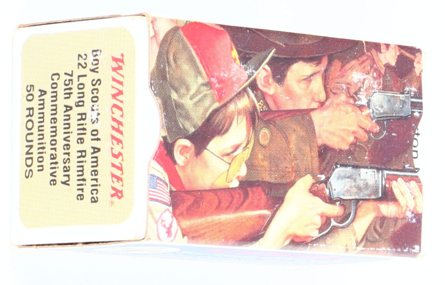 Winchester, Boy Scouts of America 75th Anniversary, .22 Long Rifle, RHWeb: WRA-70 LR-1, Full, 1pc. Multicolored box, box is near mint with minty color, only one very small scuff on top, sharp corners, crisp edges, rigid end flaps, ammo is minty. Grade: Excellent ++ - Value: 10 to 50