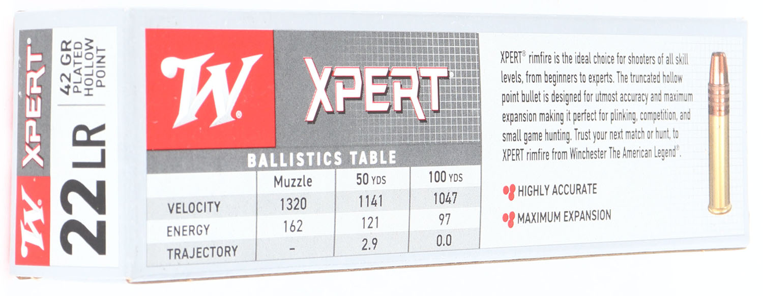 Winchester, Xpert, .22 Long Rifle, 42 Grain Copper Plated Hollow Point, 1320 FPS, Full, 100rds., 1pc. Gray red & white box, box is MINT with minty color, corners are sharp, edges are crisp, end flaps are solid, ammo is mint. Grade: MINT - Value: 10 to 50