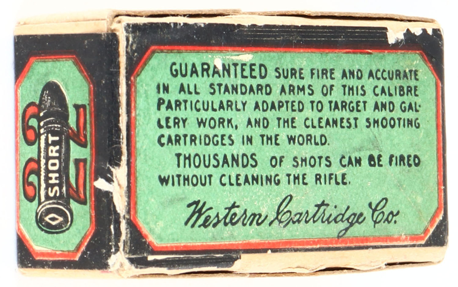 Western, Gallery Special, .22 Short, Lesmok Powder, RHWeb: WCC-48 S-4, Full, 2pc. Buff box with green & black wraparound label, box is solid with excellent color, very minor age soiling, very minor shelf & corner wear, edges are mostly crisp, label is intact, ammo is good. Grade: Excellent - Value: 100 to 400