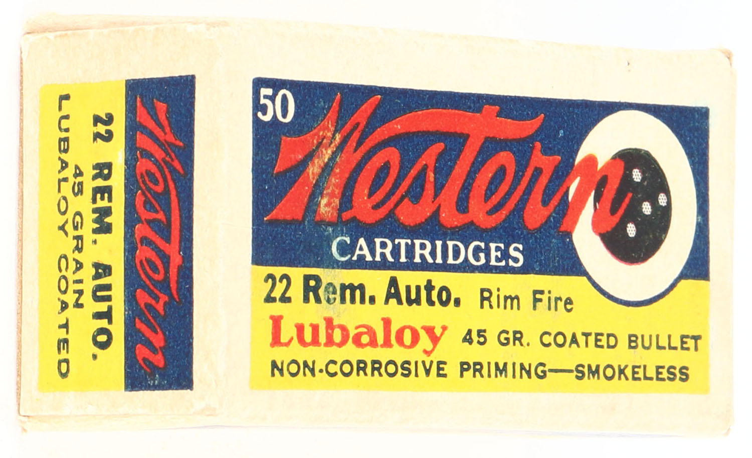 Western, Lubaloy, .22 Rem. Auto., Smokeless, RHWeb: WCC-4.4 RA-1e, Full, 1pc. Blue yellow & red bulls eye box, box is solid with excellent color, minor shelf & corner wear, edges are mostly crisp, end flaps are solid, ammo is excellent. Grade: Excellent - Value: 100 to 200