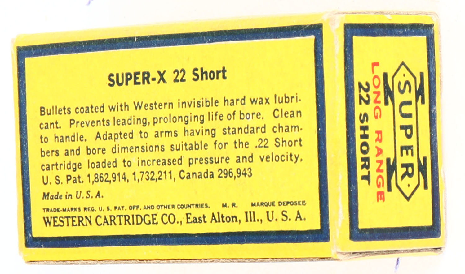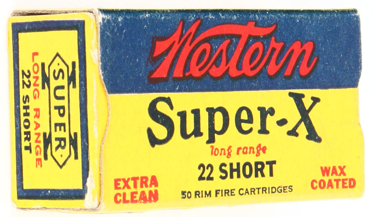 Western, Super-X, .22 Short, Extra Clean Wax Coated, RHWeb: WCC-Super-X-7 S-14, Full, 1pc. Yellow blue & red box, box is solid with excellent color, very minor corner wear, edges are crisp, end flaps are solid, ammo is excellent to minty. Grade: Excellent ++ - Value: 10 to 40