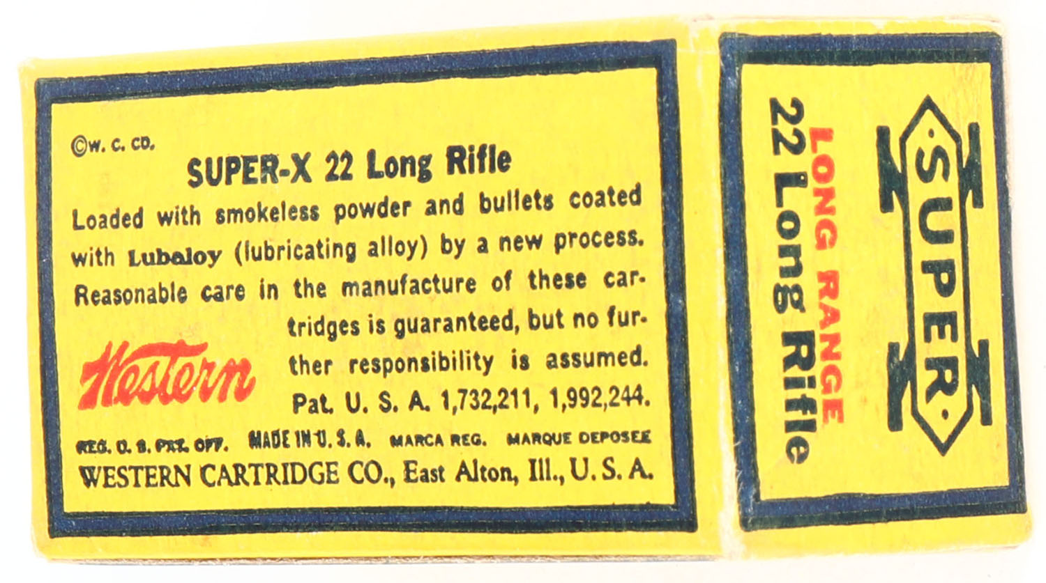 Western, Super-X, .22 Long Rifle, Long Range, RHWeb: WCC-Super-X-3 LR-9, Full, 1pc. Yellow blue & red box, box is solid with very good to excellent color, very minor age soiling, corners are mostly sharp, edges are crisp, end flaps are solid, ammo is excellent. Grade: Excellent + - Value: 8 to 40