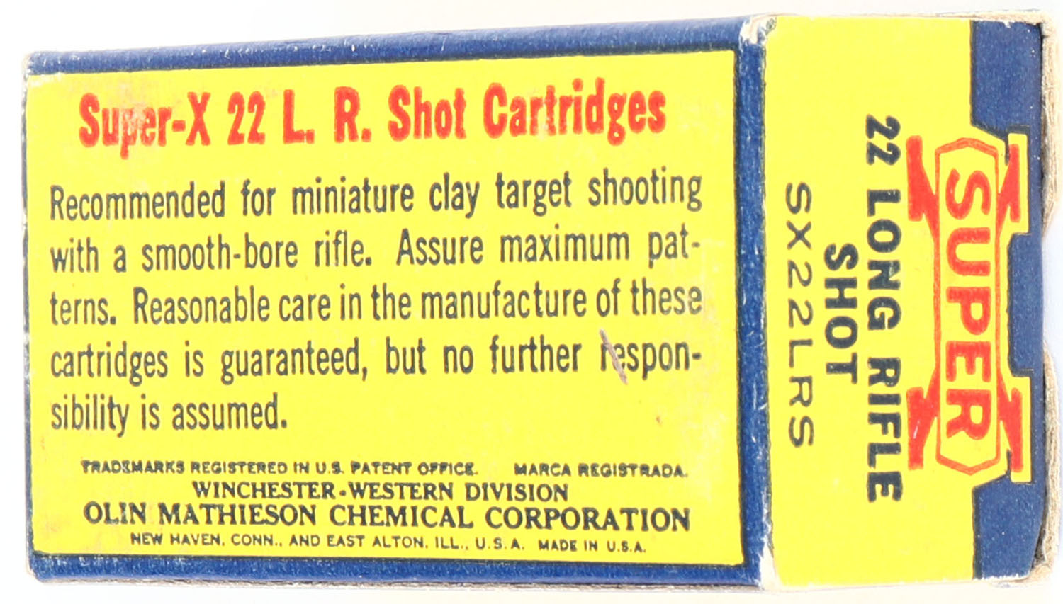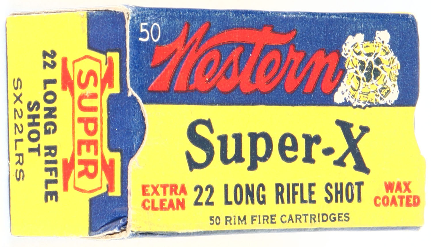 Western, Super-X, .22 Long Rifle Shot, RHWeb: WCC-Super-X Long Rifle-49 LRS-21, Full, 1pc. Yellow blue & red box, box is solid with minty color, very minor corner wear, edges are mostly crisp, end flaps are solid, ammo is excellent. Grade: Excellent ++ - Value: 20 to 60