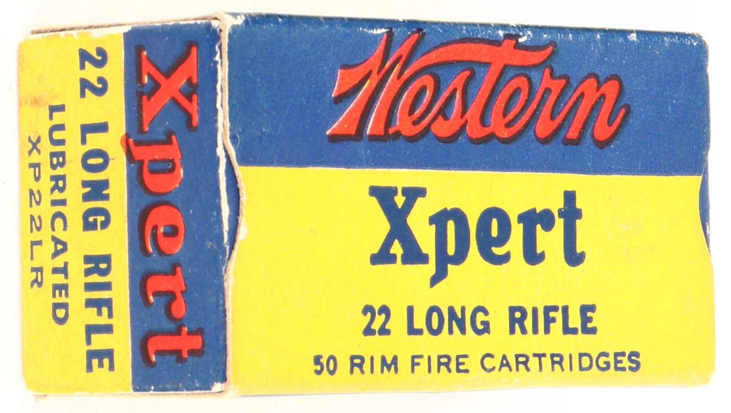 Western, Xpert, .22 Long Rifle, Lubricated, RHWeb: WCC-52 LR-1k, Full, 1pc. Yellow blue & red box, box is solid with excellent color, very minor corner wear, edges are mostly crisp, end flaps are solid, ammo is excellent. Grade: Excellent + - Value: 6 to 30
