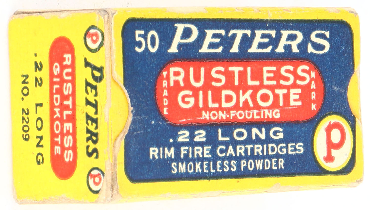 Peters, Rustless Gildkote, .22 Long, RHWeb: PCC-10 L-1, Full, 1pc. Blue yellow & red box, box is solid with excellent color, very minor age soiling, some edge & corner wear, end flaps are solid, ammo is excellent. Grade: Excellent - Value: 50 to 250
