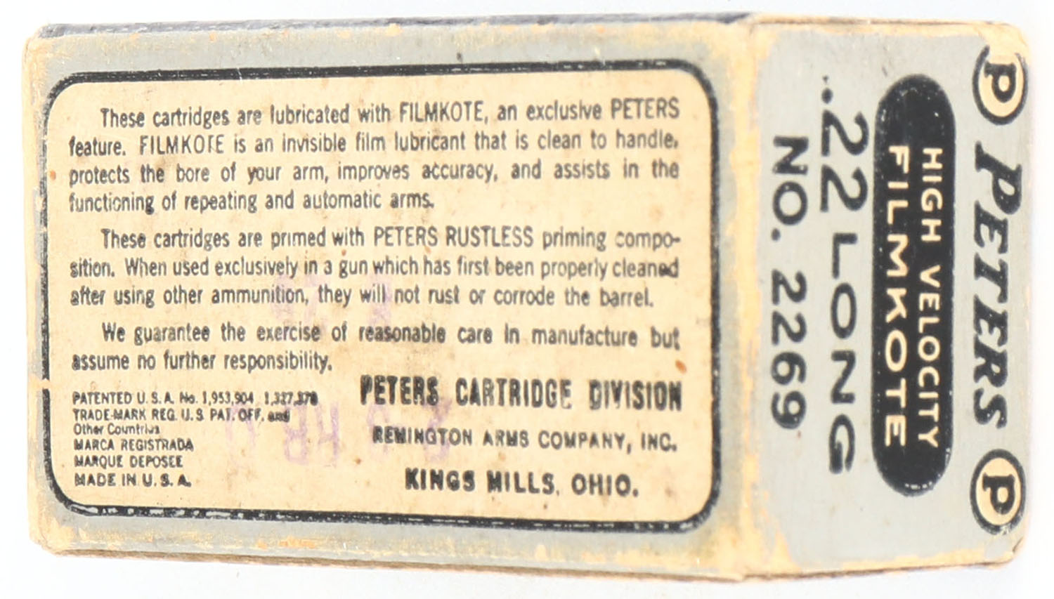 Peters, High Velocity Filmkote, .22 Long, RHWeb: PCC-13 L-1f, Full, 1pc. Silver & black box, box is solid with very good color, some age soiling, edge & corner wear, end flaps are solid, ammo is very good to excellent. Grade: Excellent - Value: 10 to 50