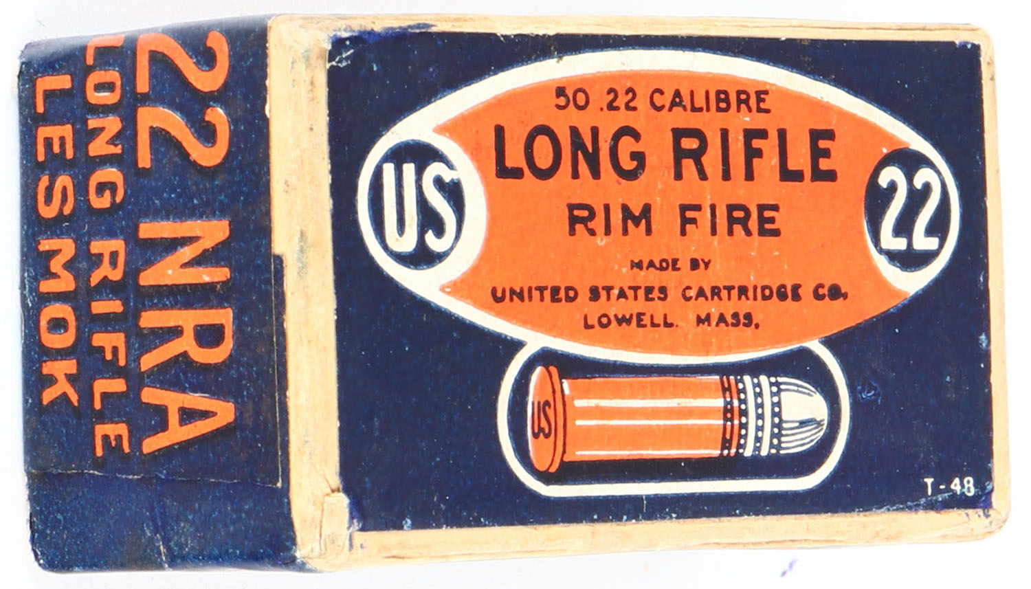 U.S., 22 NRA, .22 Long Rifle, Lesmok, RHWeb: US-51 LR-5, FULL & SEALED, 2pc. Buff box with blue/orange top & side sealing labels, box is solid with excellent color, very minor age soiling, some edge & corner wear, labels are intact. Grade: Excellent + - Value: 20 to 80