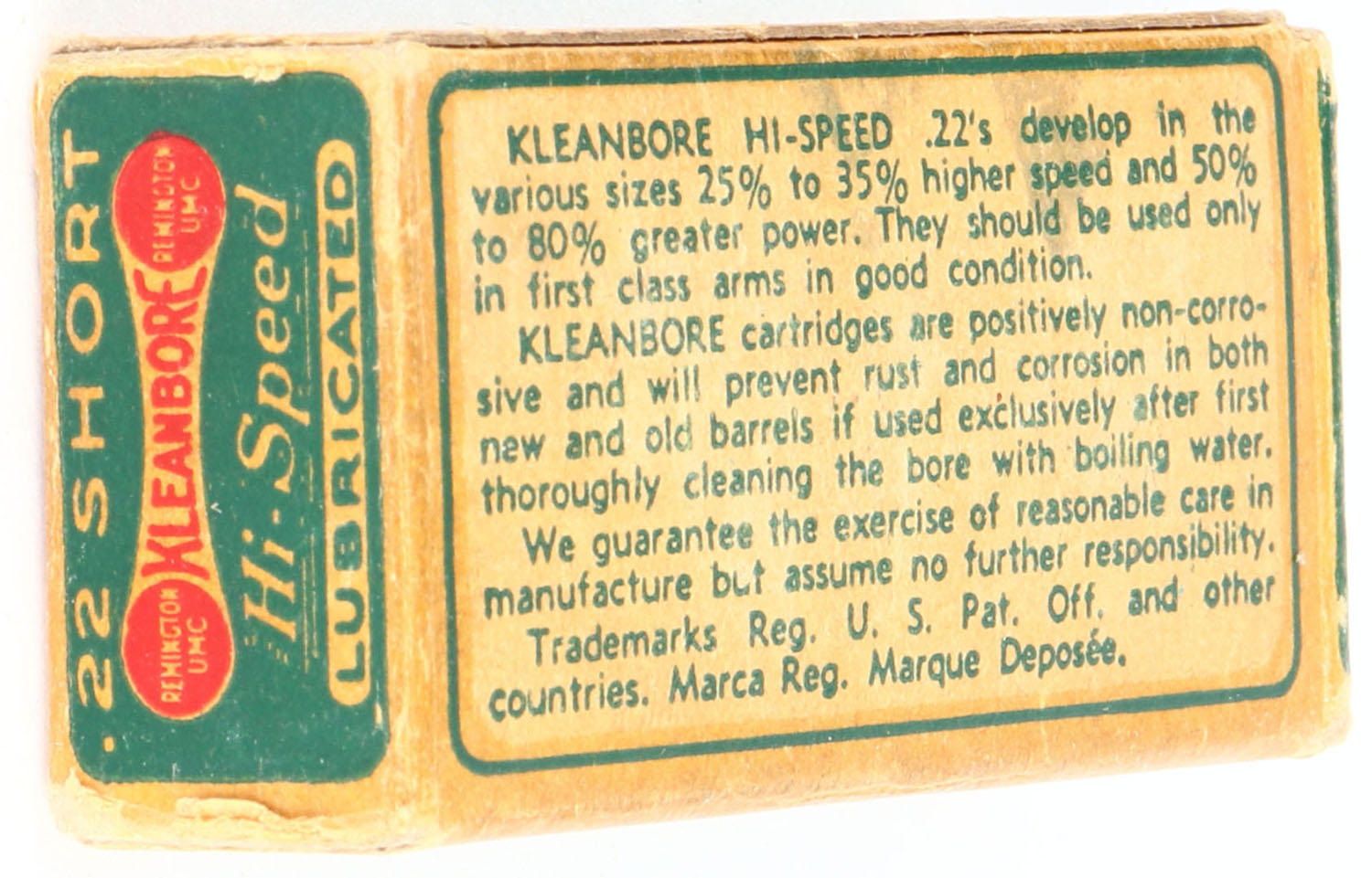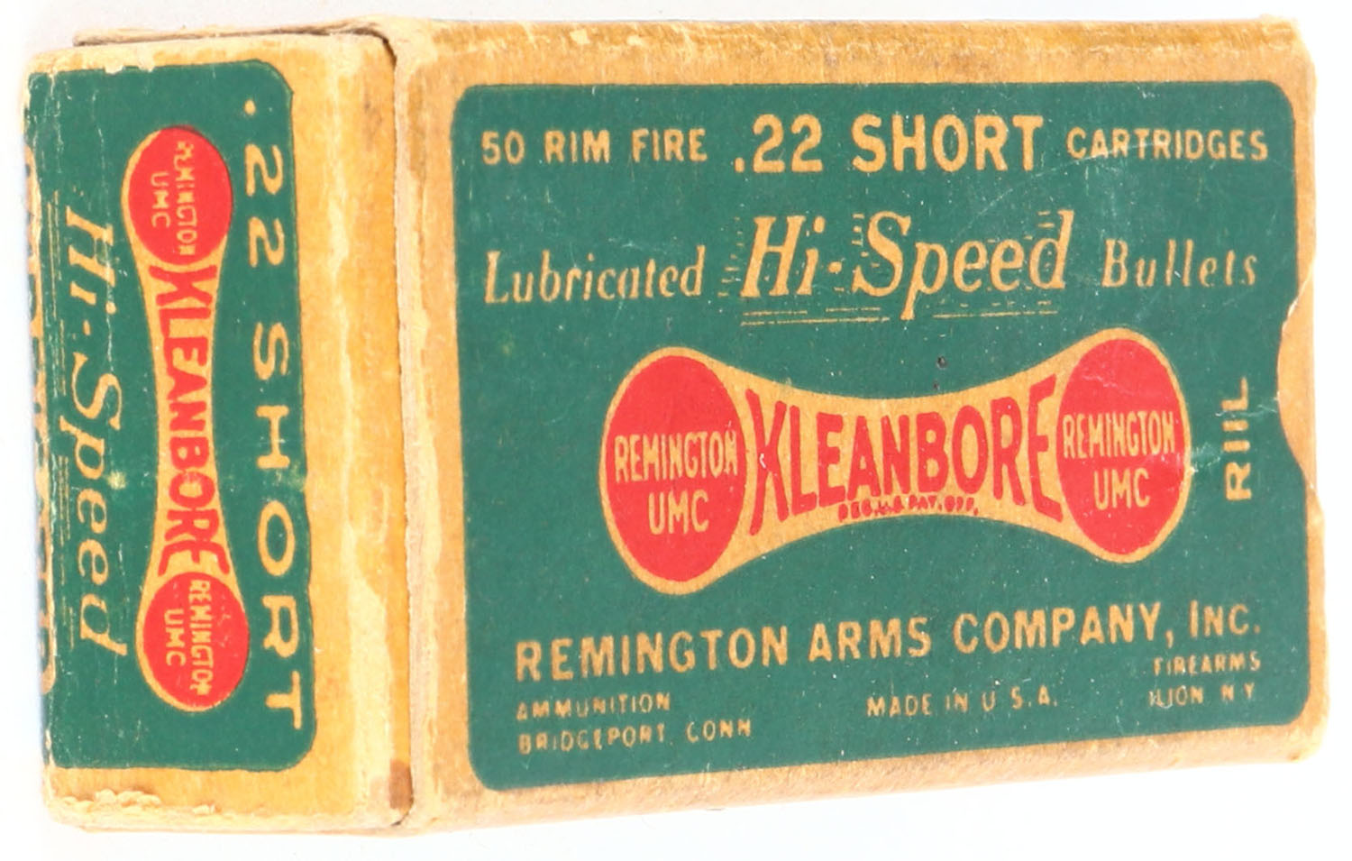 Remington, Kleanbore Hi-Speed, .22 Short, R11L, RHWeb: REM-7.4 S-1h, Full, 1pc. Green buff & red dogbone box, box is solid with very good color, some age soiling, some corner wear, minor edge wear, end flaps are solid, ammo is excellent. Grade: Very Good ++ - Value: 8 to 40