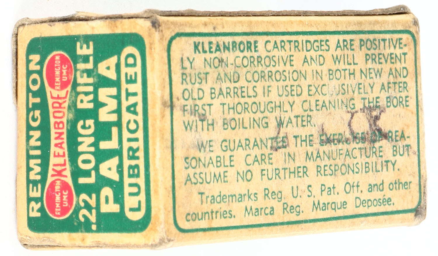 Remington, Kleanbore Palma, .22 Long Rifle, RHWeb: REM-52 LR-88c, Full, 1pc. Green buff & red dogbone box, box is solid with very good color, age soiling, some corner wear, edges are mostly crisp, end flaps are solid, ammo is excellent. Grade: Very Good + - Value: 8 to 40