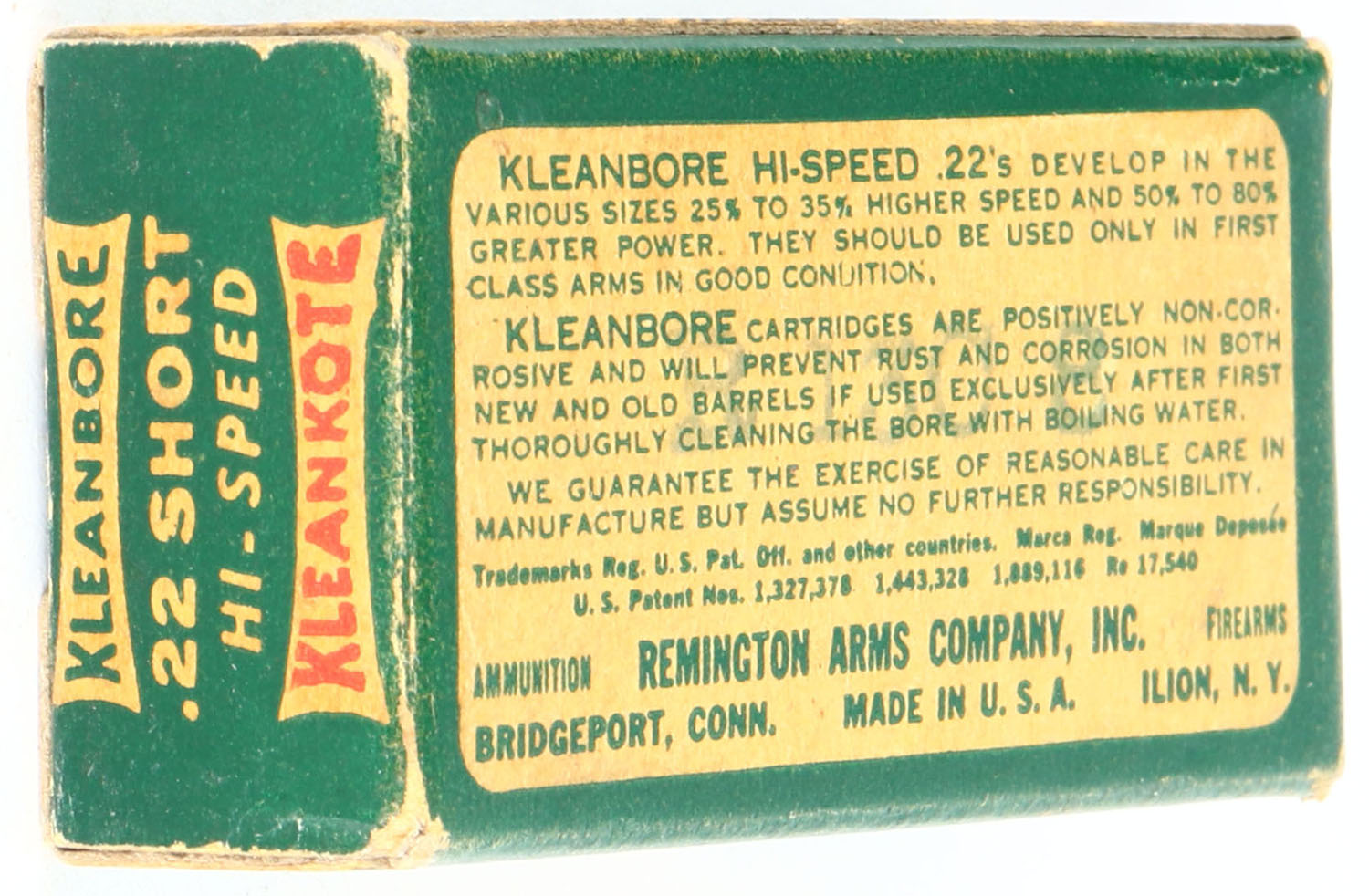 Remington, Kleanbore Kleankote, .22 Short, Hi-Speed, RHWeb: REM-9 S-1b, Full, 1pc. Green white & red box, box is solid with very good color, some age soiling, minor edge & corner wear, end flaps are solid, ammo is excellent. Grade: Very Good ++ - Value: 10 to 40