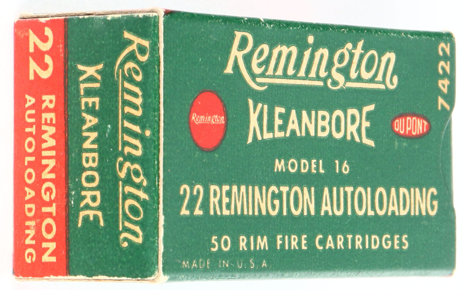 Remington, Kleanbore, .22 Remington Autoloading, 7422, RHWeb: REM-12 RA-1b, Full, 1pc. Greed white & red box, box is solid with excellent color, very minor age soiling & corner wear, edges are crisp, end flaps are solid, ammo is excellent to minty. Grade: Excellent + - Value: 50 to 150