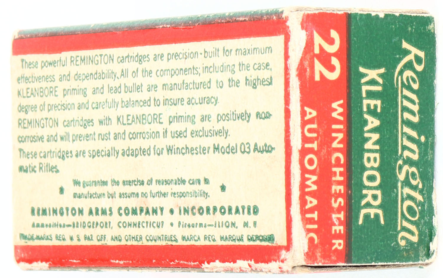Remington, Kleanbore, .22 Winchester Automatic, 7522, RHWeb: REM-12 WA-1b, Full, 1pc. Green white & red box, box is solid with very good color, some age soiling, partial seam split to left end flap tab, some edge & corner wear, top has been written on, ammo is excellent. Grade: Very Good - Value: 20 to 80
