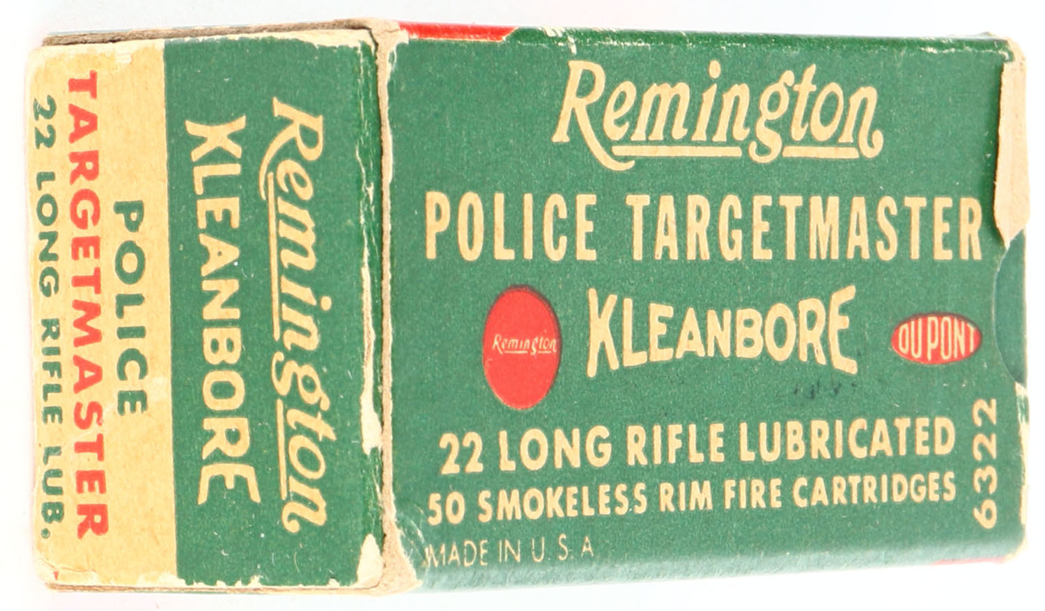 Remington, Police TargetMaster, .22 Long Rifle, Kleanbore, RHWeb: REM-69 LR-2d, Full, 1pc. Green white & red box, box is solid with excellent color, minor age soiling & corner wear, very minor edge wear, end flaps are solid, ammo is excellent. Grade: Excellent - Value: 10 to 40