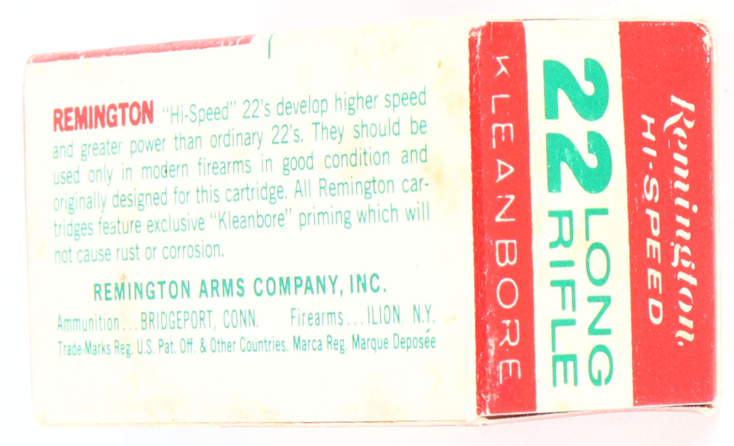 Remington, Hi-Speed, .22 Long Rifle, ''Golden'' Bullet, RHWeb: REM-17 LR-1a, Full, 1pc. Red white & green box, box is solid with excellent color, some staining, very minor corner wear, edges are crisp, ammo is excellent. Grade: Excellent - Value: 4 to 20