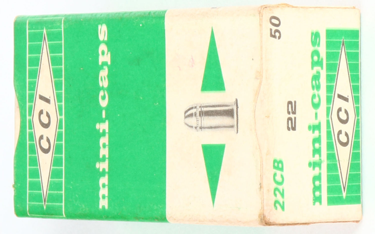 CCi, mini-caps, .22 C.B. Caps, RHWeb: CCI-3 CB-1b, Full, 1pc. Green & white box, box is solid with very good to excellent color, minor age soiling, very minor corner wear, edges are crisp, end flaps are solid, ammo is excellent to minty. Grade: Excellent - Value: 10 to 50